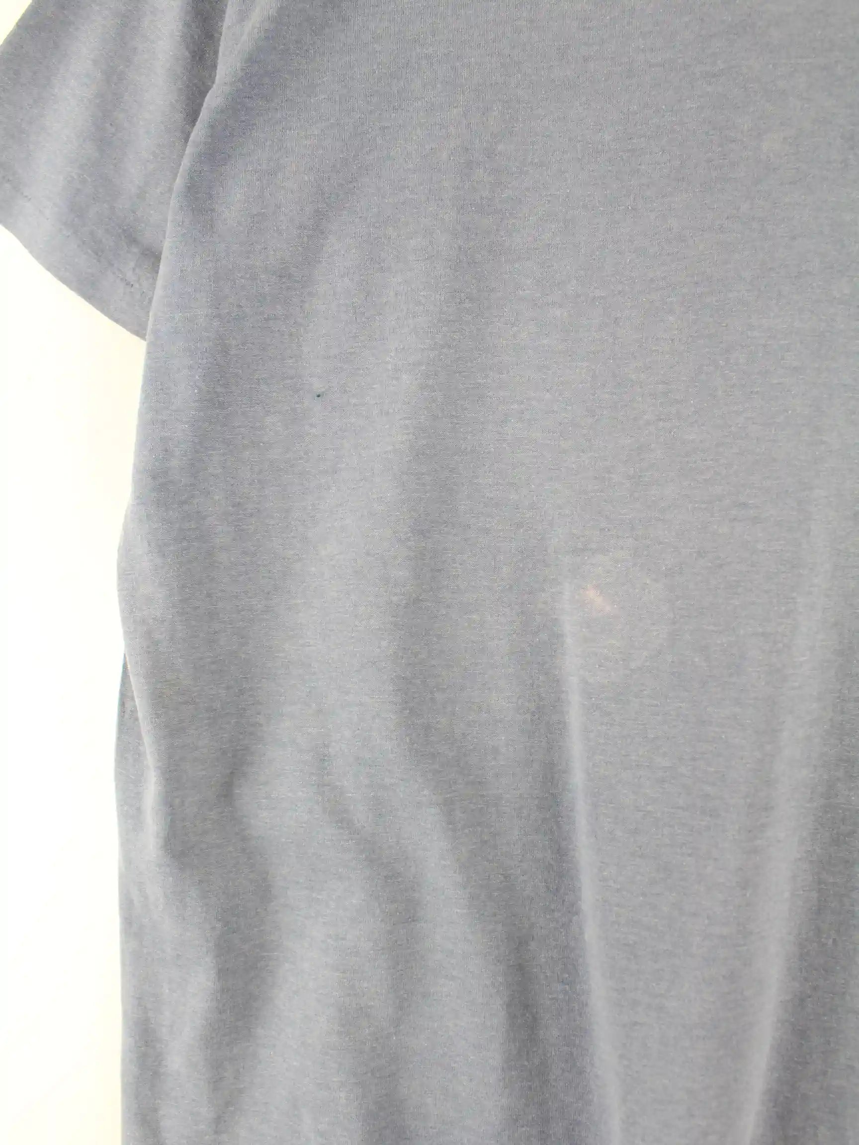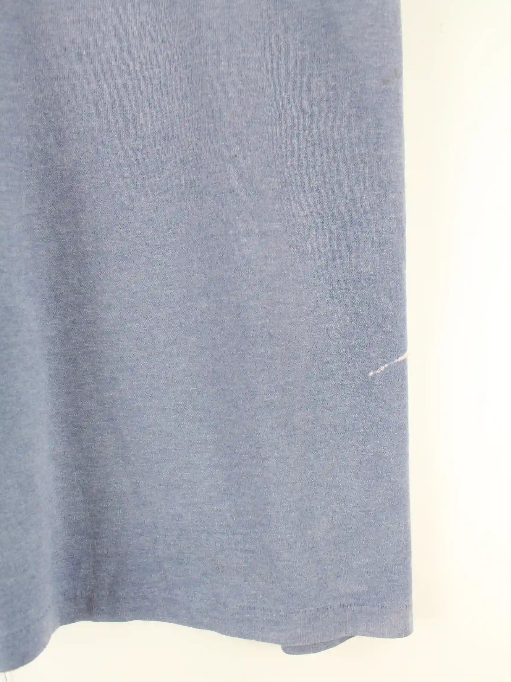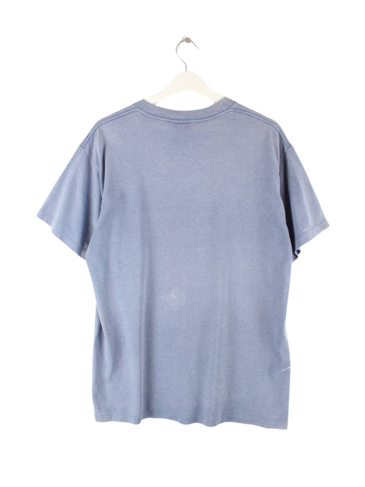 Vintage T-Shirt in Größe L aus den 90'ern. Es ist aus Baumwolle hergestellt und in Blau bei uns zu bekommen. Mit schönem Boots Print.