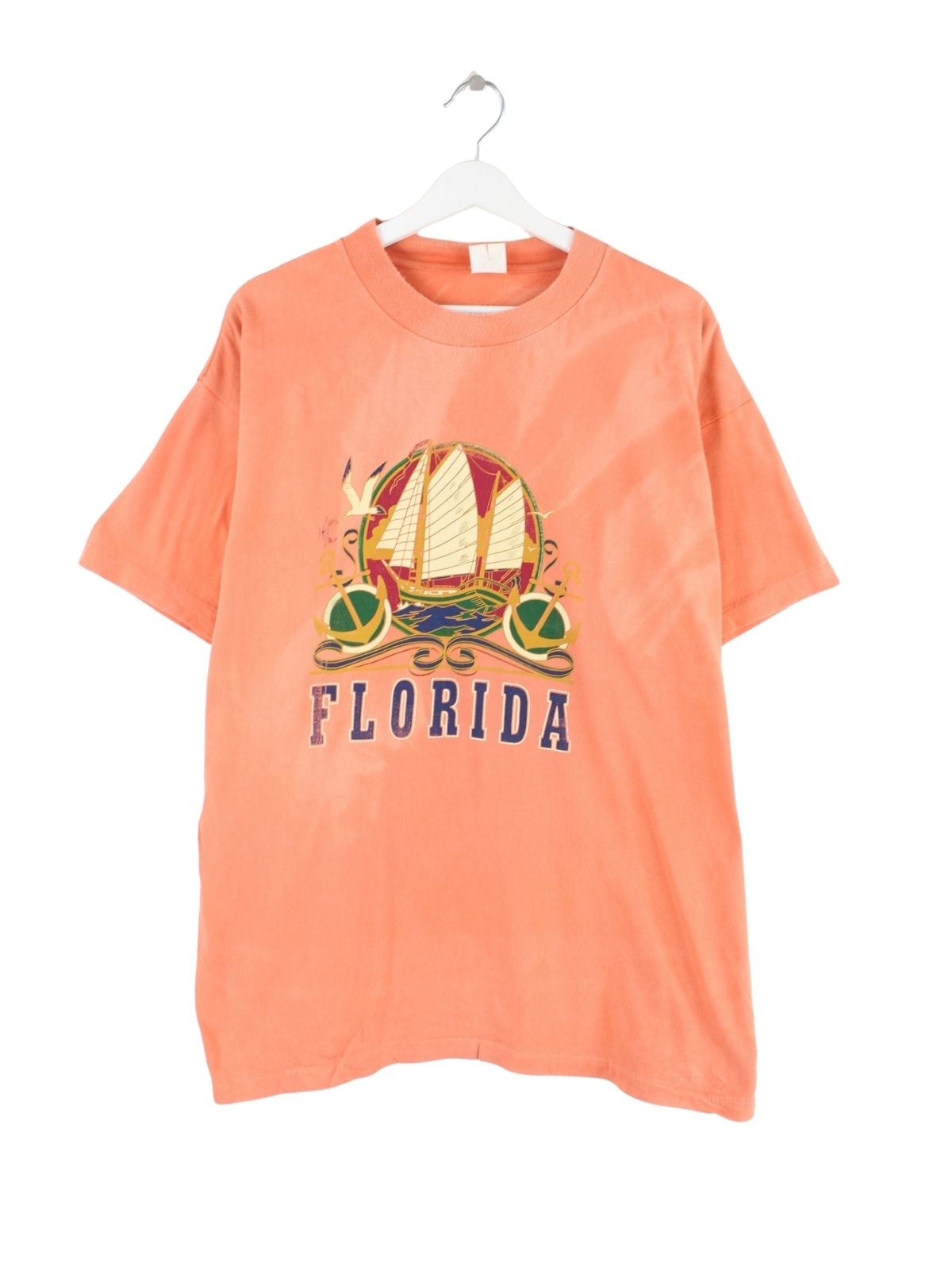 Orangefarbenes Vintage T-Shirt aus den 90'ern in Größe XL. Es ist aus Baumwolle produziert. Den Zustand würden wir als 'In Ordnung' bezeichnen (vergl. Bilder).Mit seltenem Florida Print.