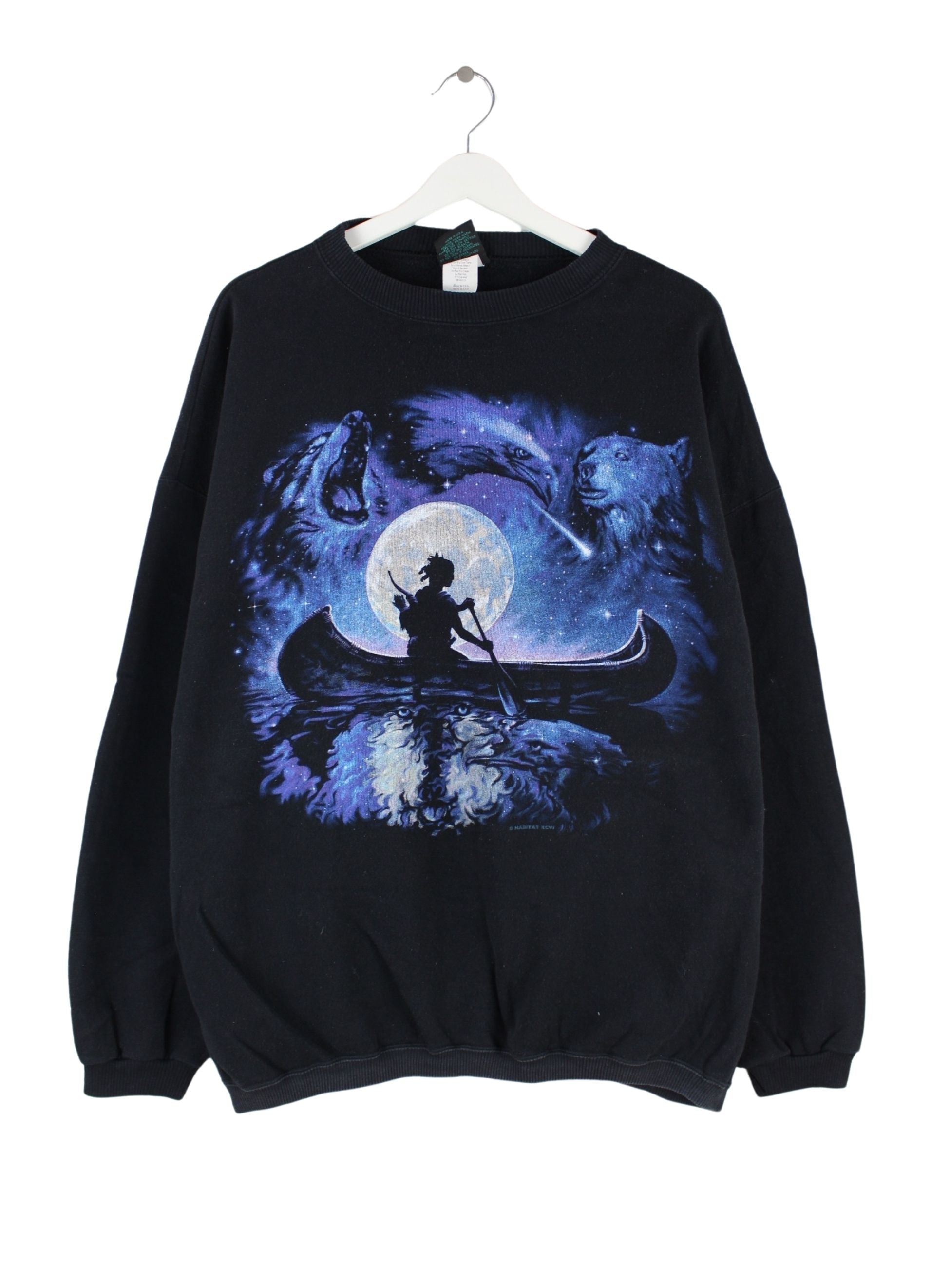 Schwarzer Vintage Sweater aus den 90'ern in Größe XXL. Er ist aus einer Baumwollmischung hergestellt und in sehr gutem Zustand zu bekommen. Mit tollem Lake Print.