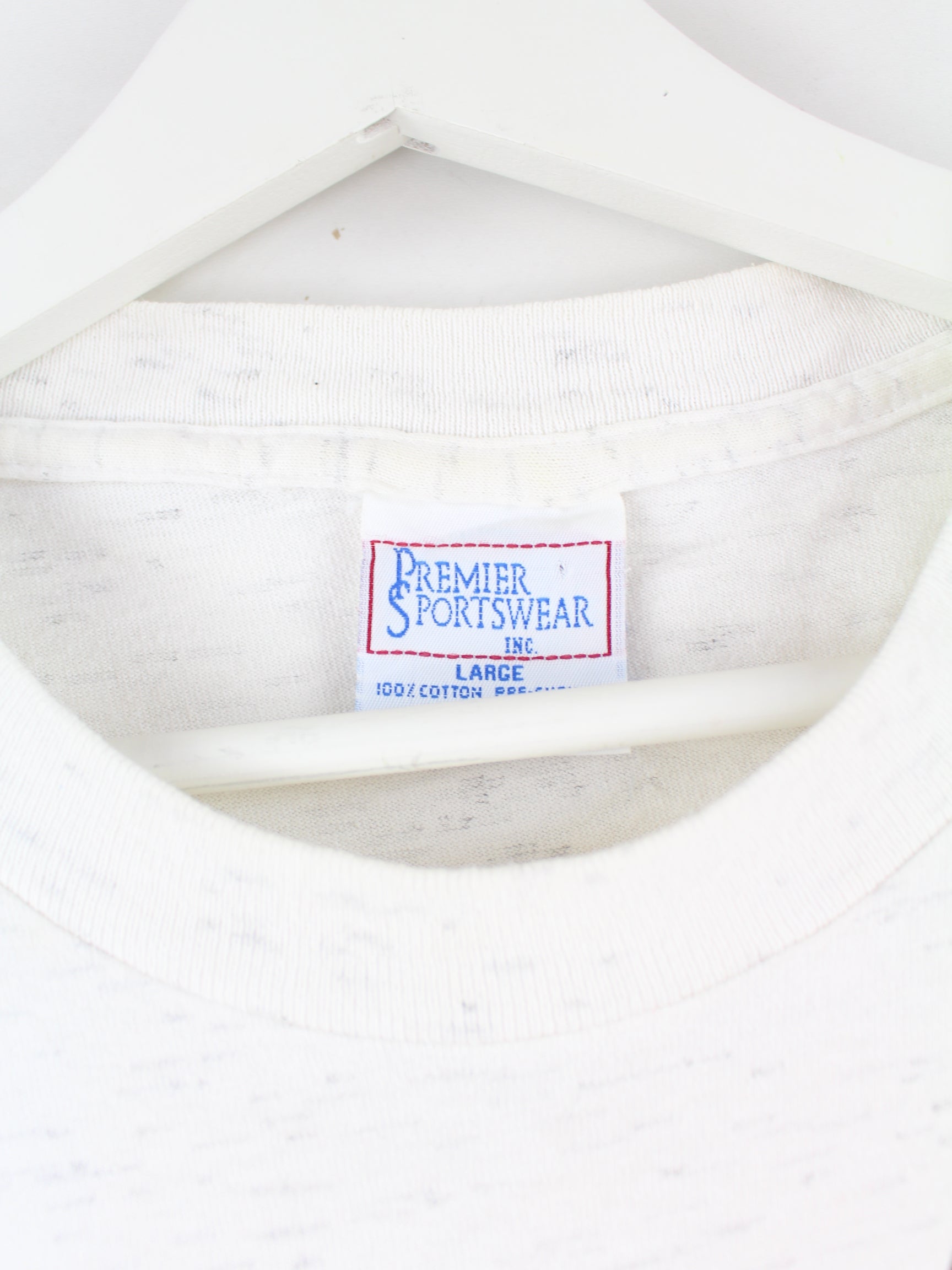 Weißes Vintage T-Shirt aus den 90'ern in Größe L. Es ist aus Baumwolle hergestellt und in gutem Zustand zu bekommen. Mit seltenem Port Print.