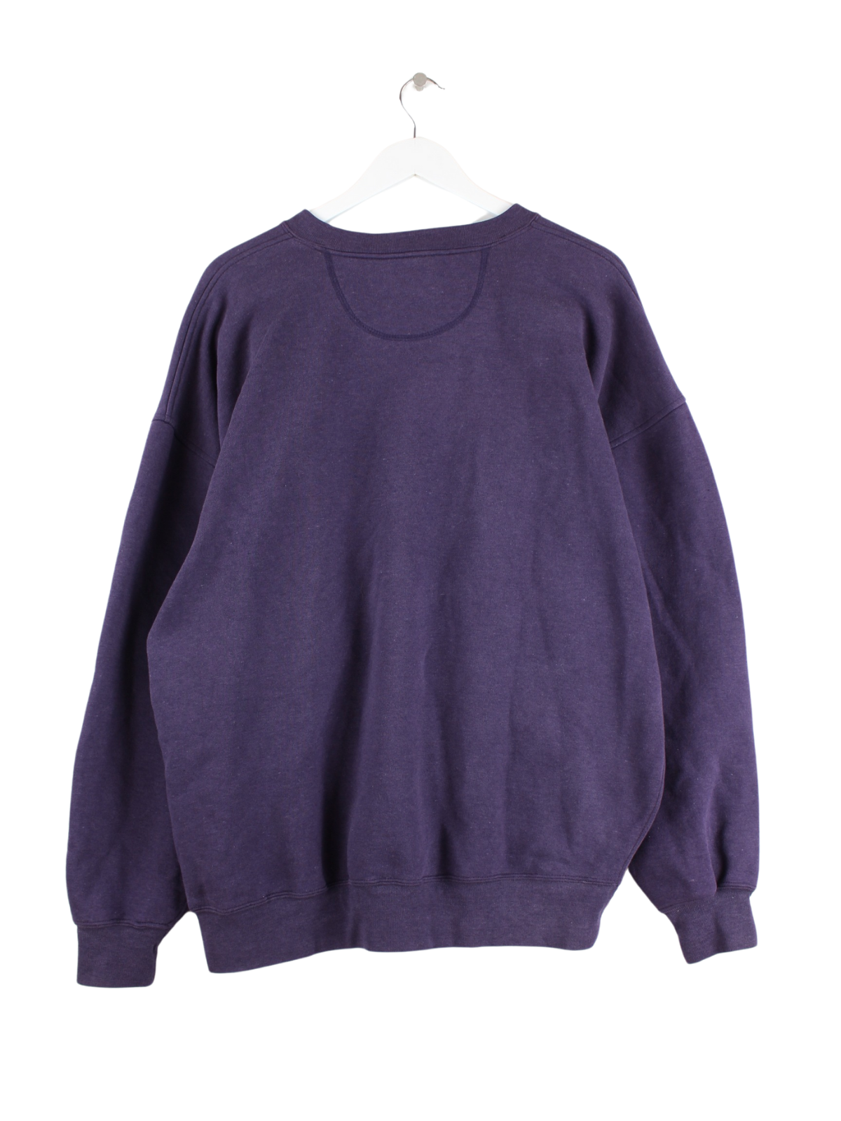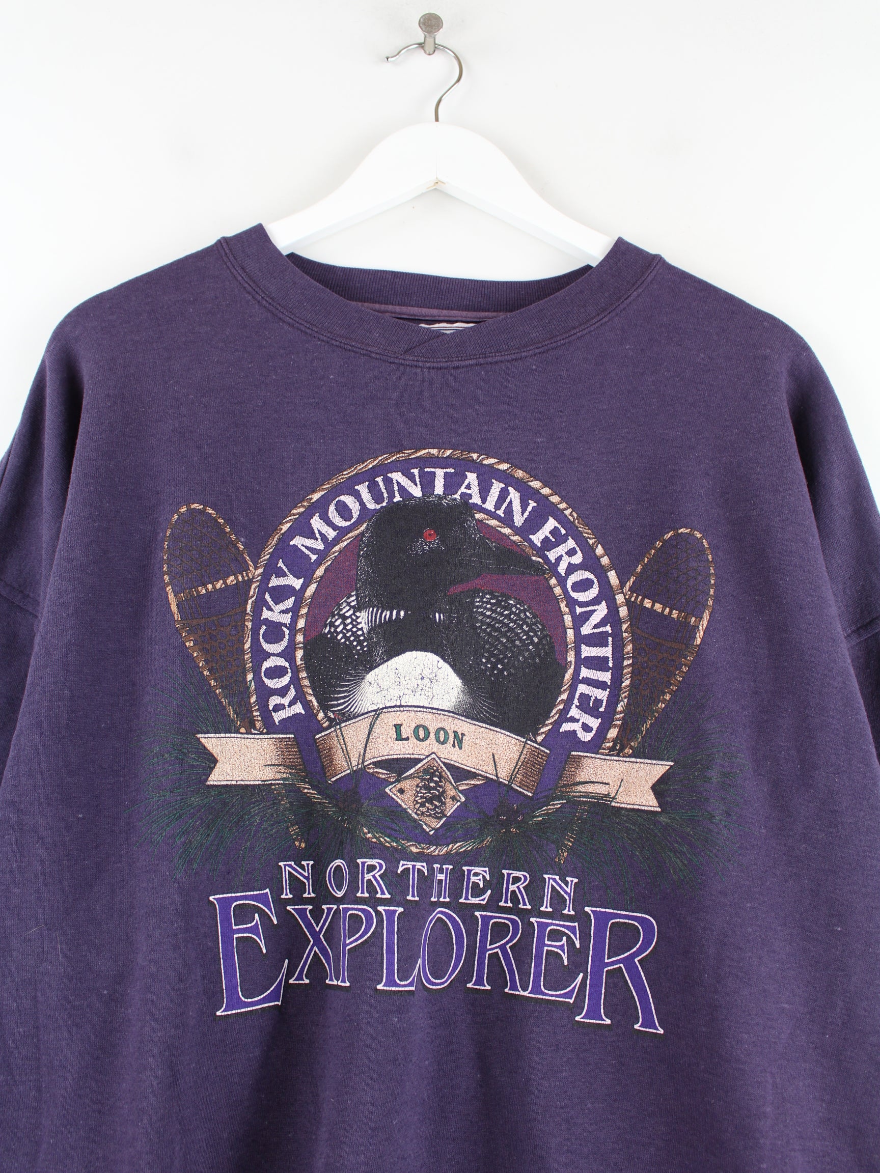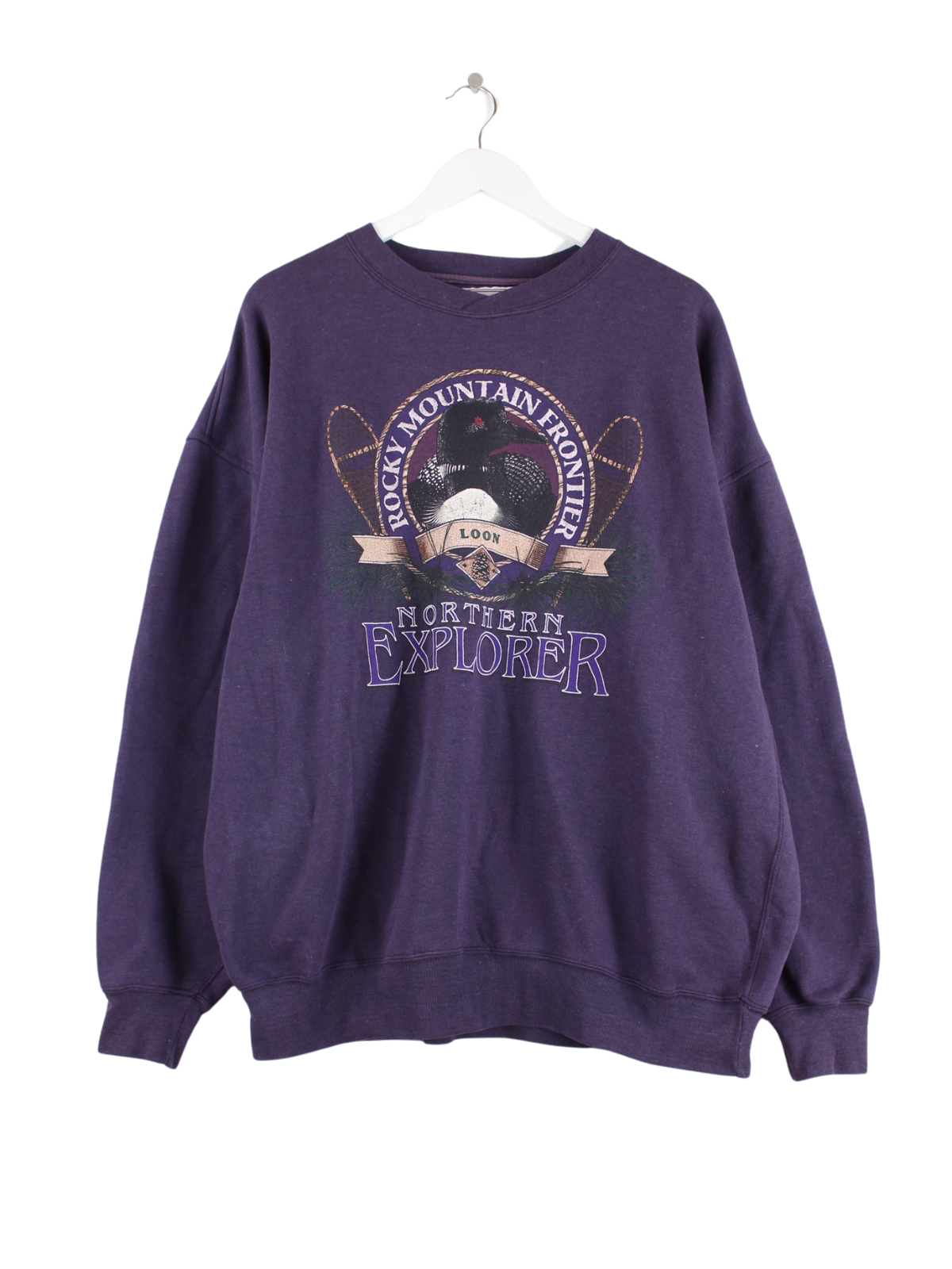 Lilafarbener Vintage Sweater aus den 90'ern in Größe XL. Er ist aus einer Baumwollmischung hergestellt und in sehr gutem Zustand zu bekommen. Mit tollem Explorer Print.