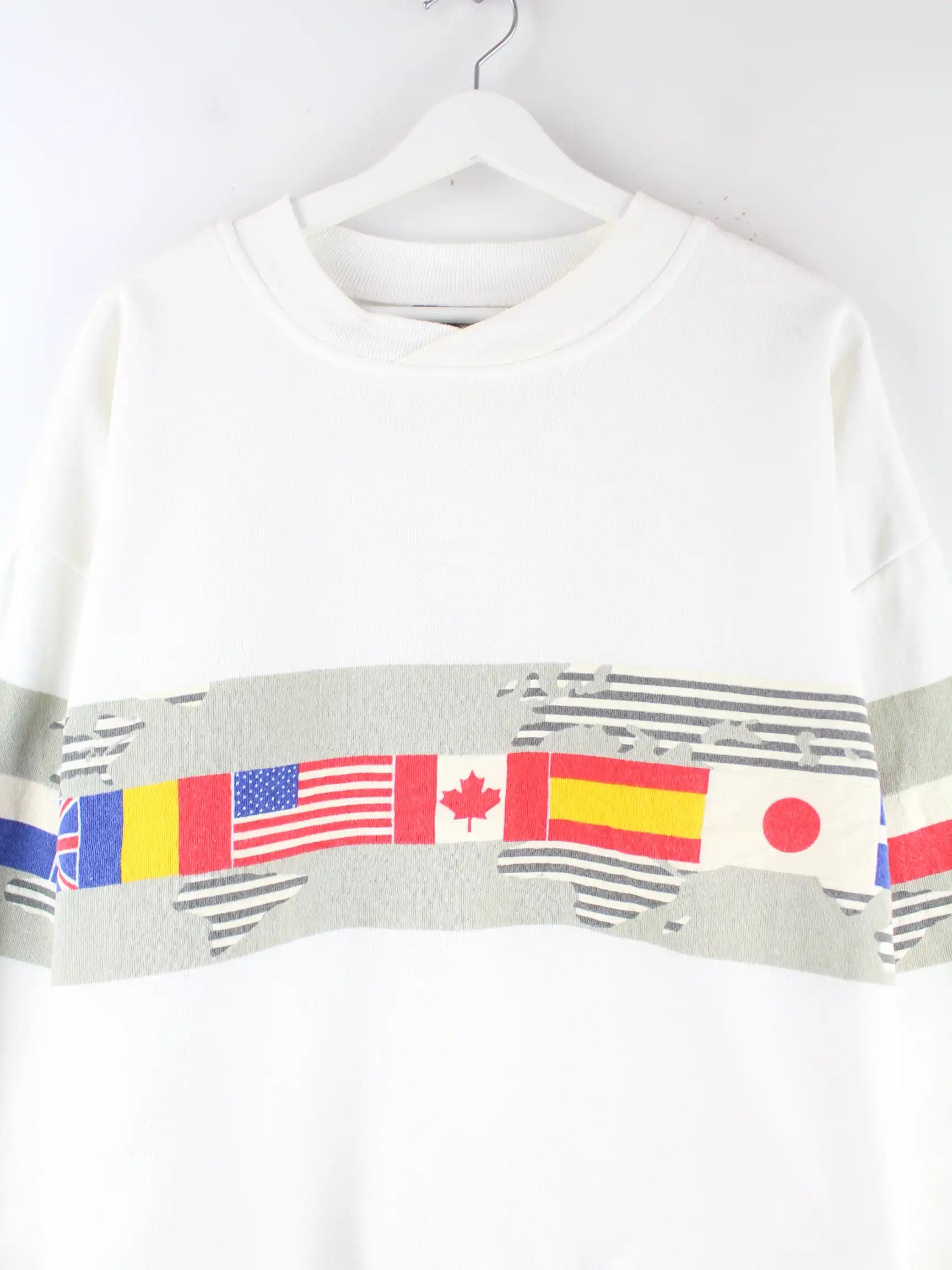 Weißer Vintage Sweater aus den 90'ern in Größe L. Er ist aus einer Baumwollmischung und in gutem Zustand auf Lager. Mit seltenem Olympia Print.
