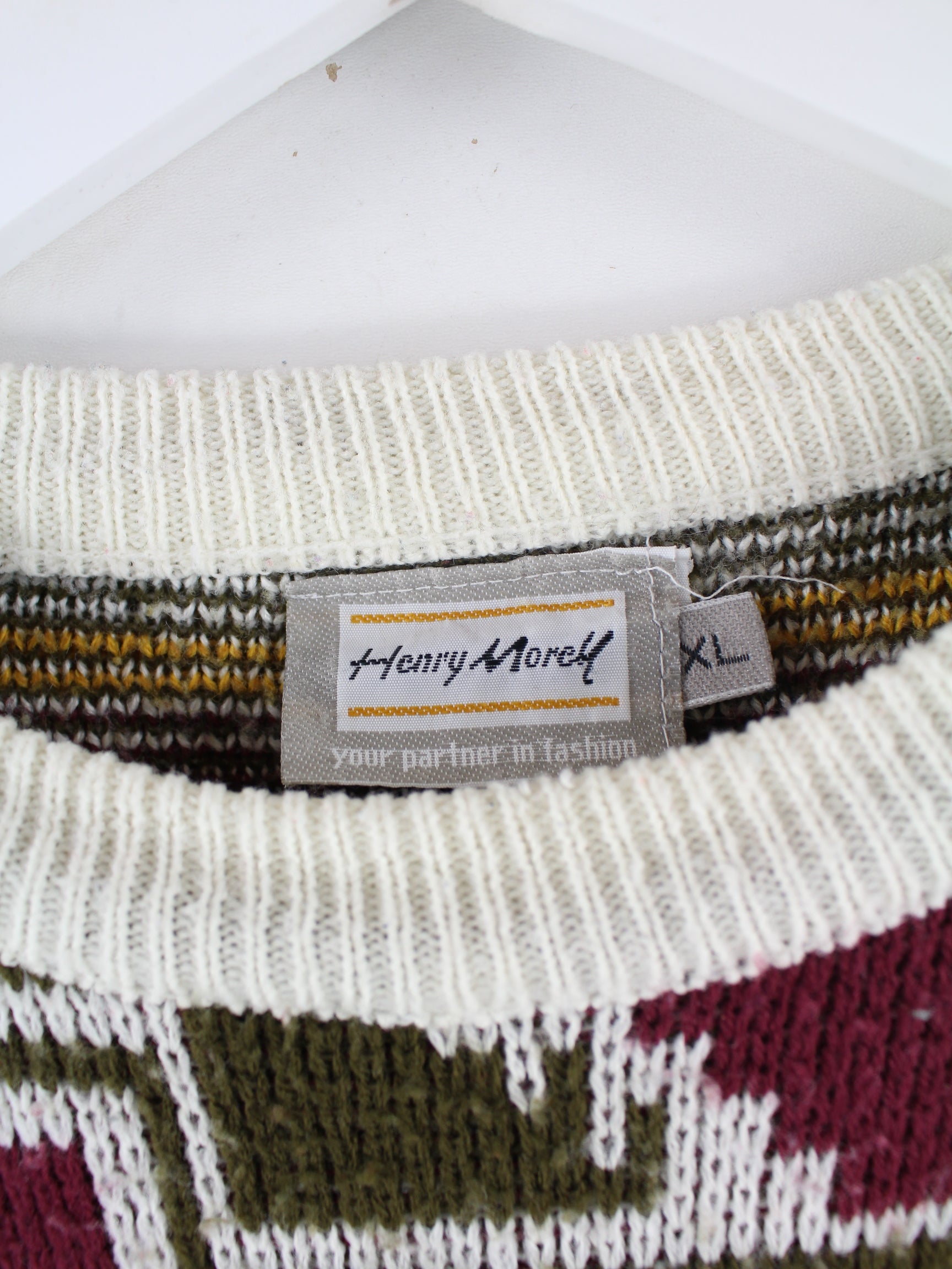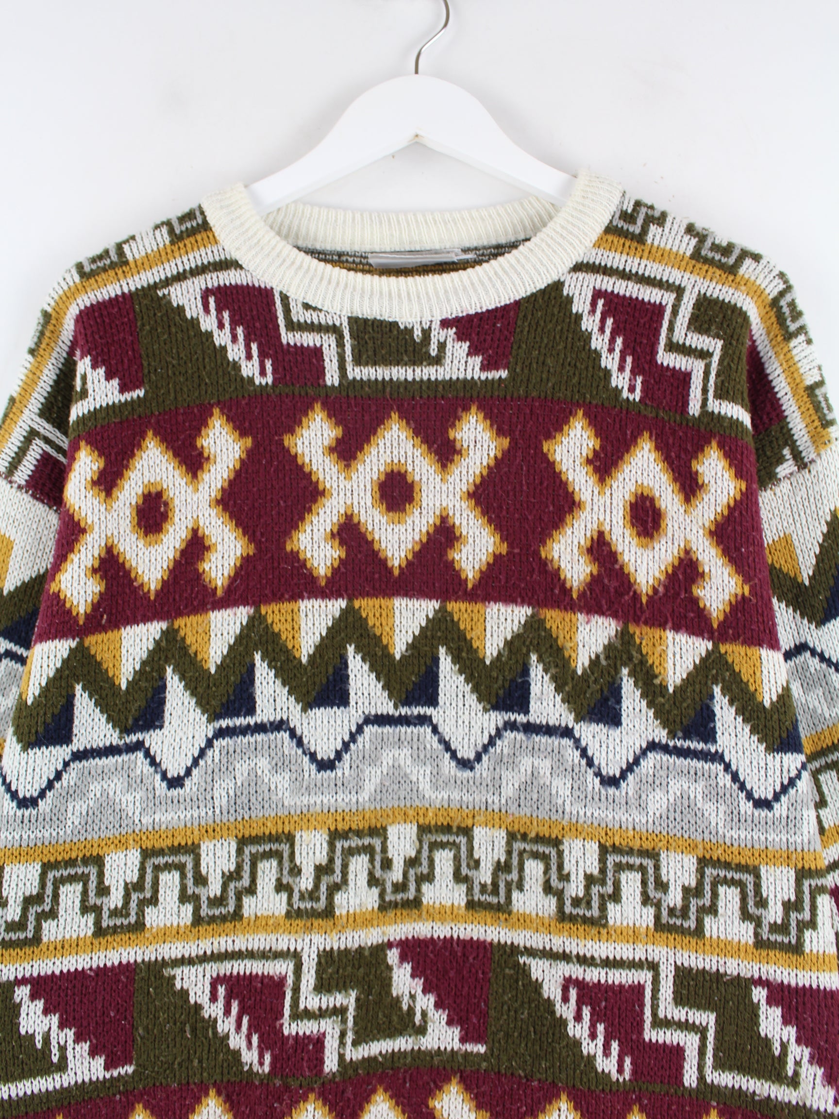 Mehrfarbiger Vintage Pullover aus den 90'ern in Größe XL. Er ist aus Baumwolle und in gutem Zustand lieferbar.