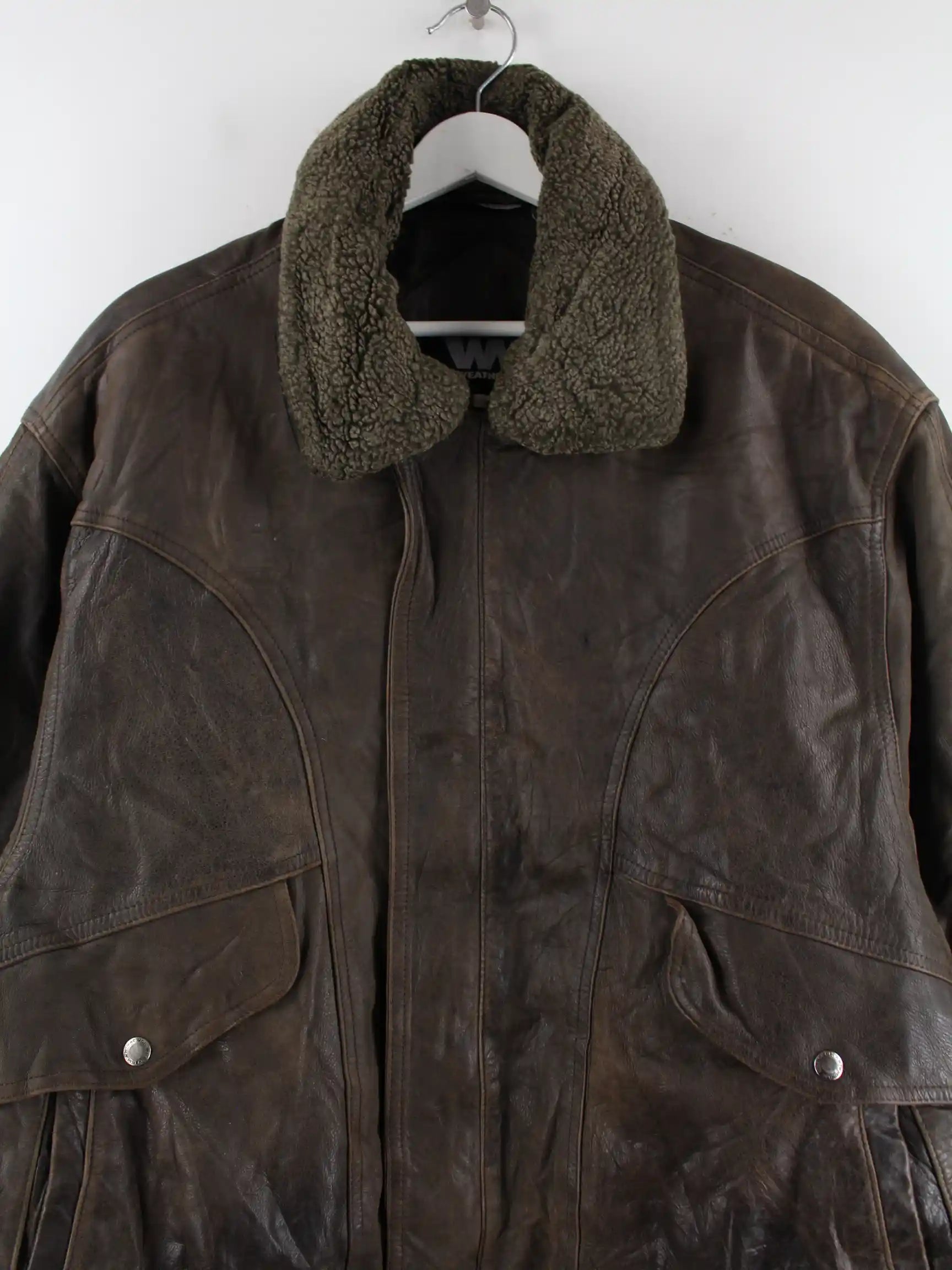 Vintage Jacke in Größe XL aus den 90'ern. Sie ist aus Leder angefertigt und in Braun im Bestand.