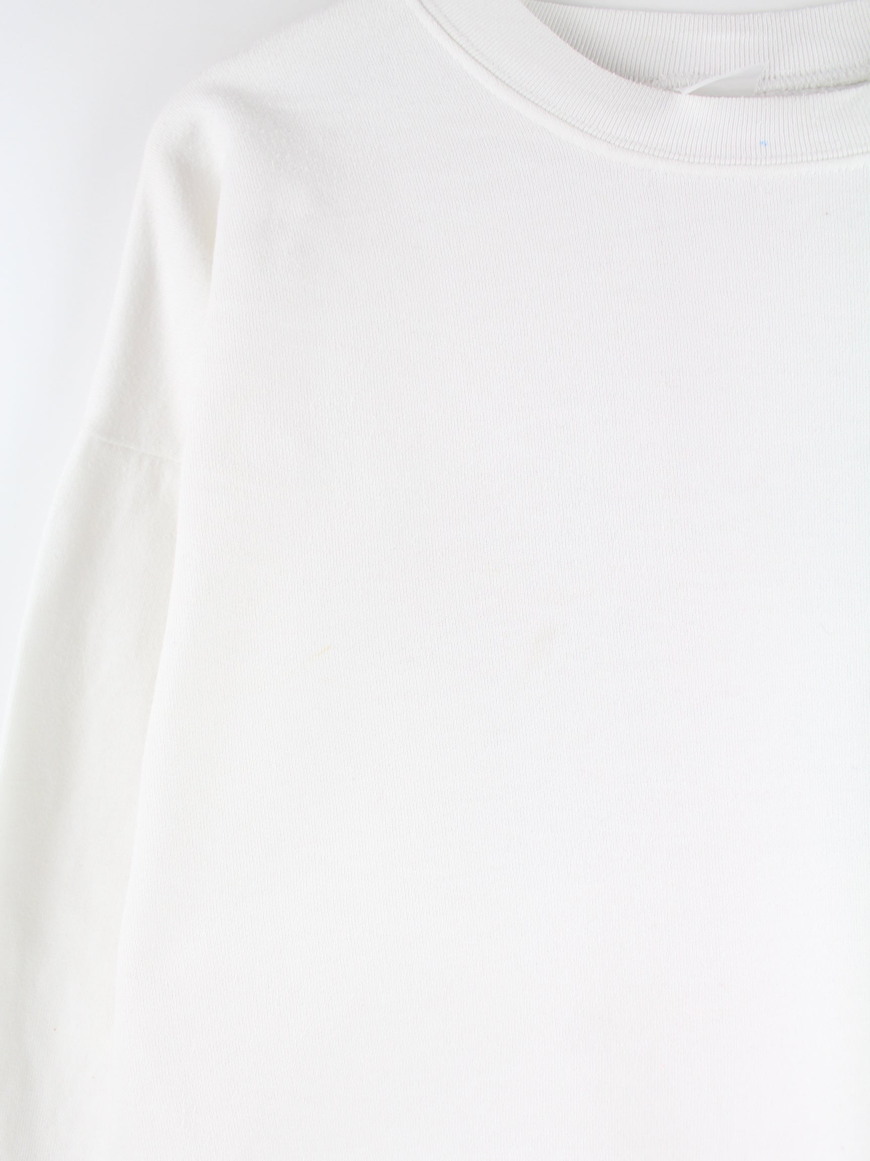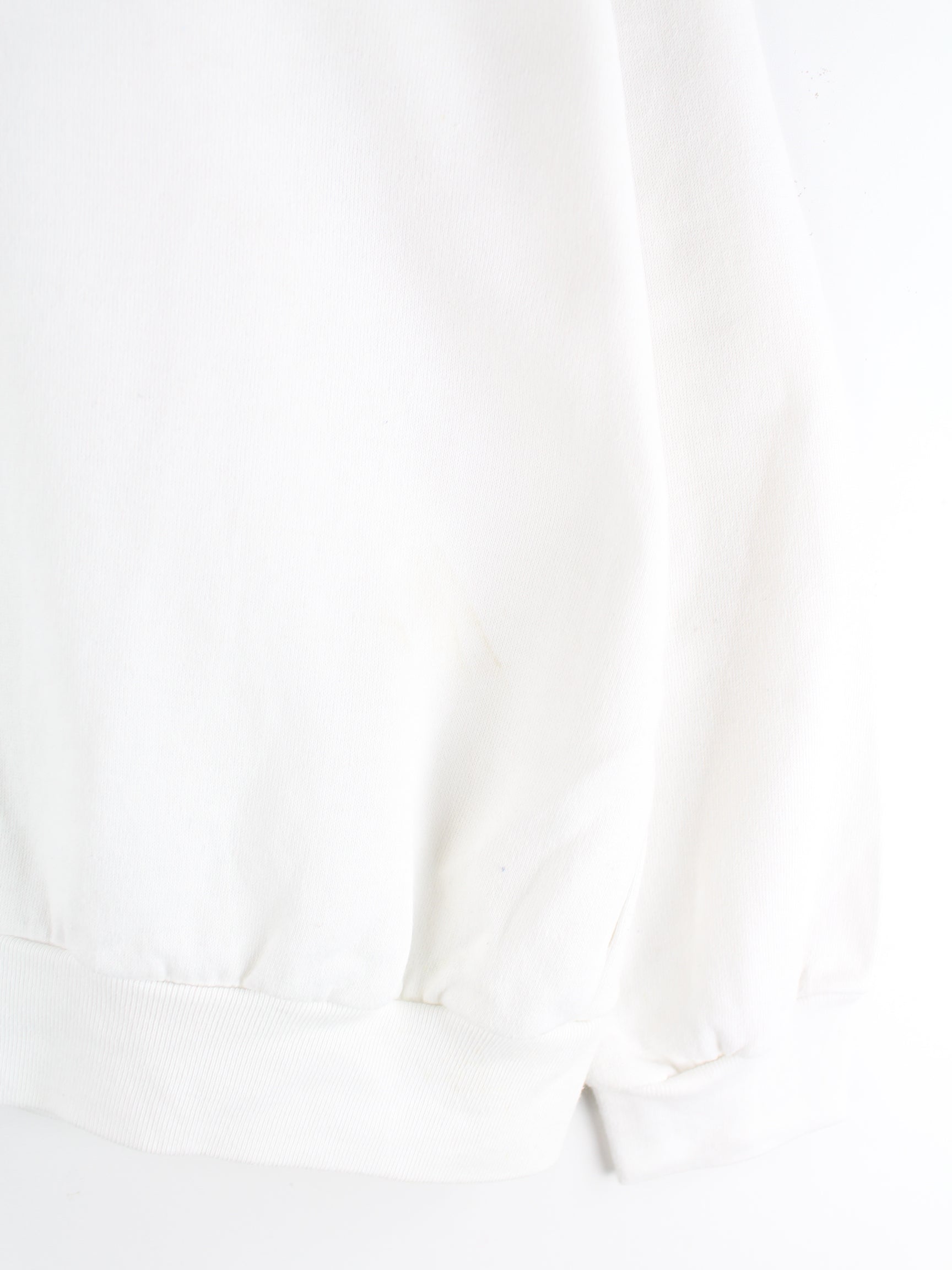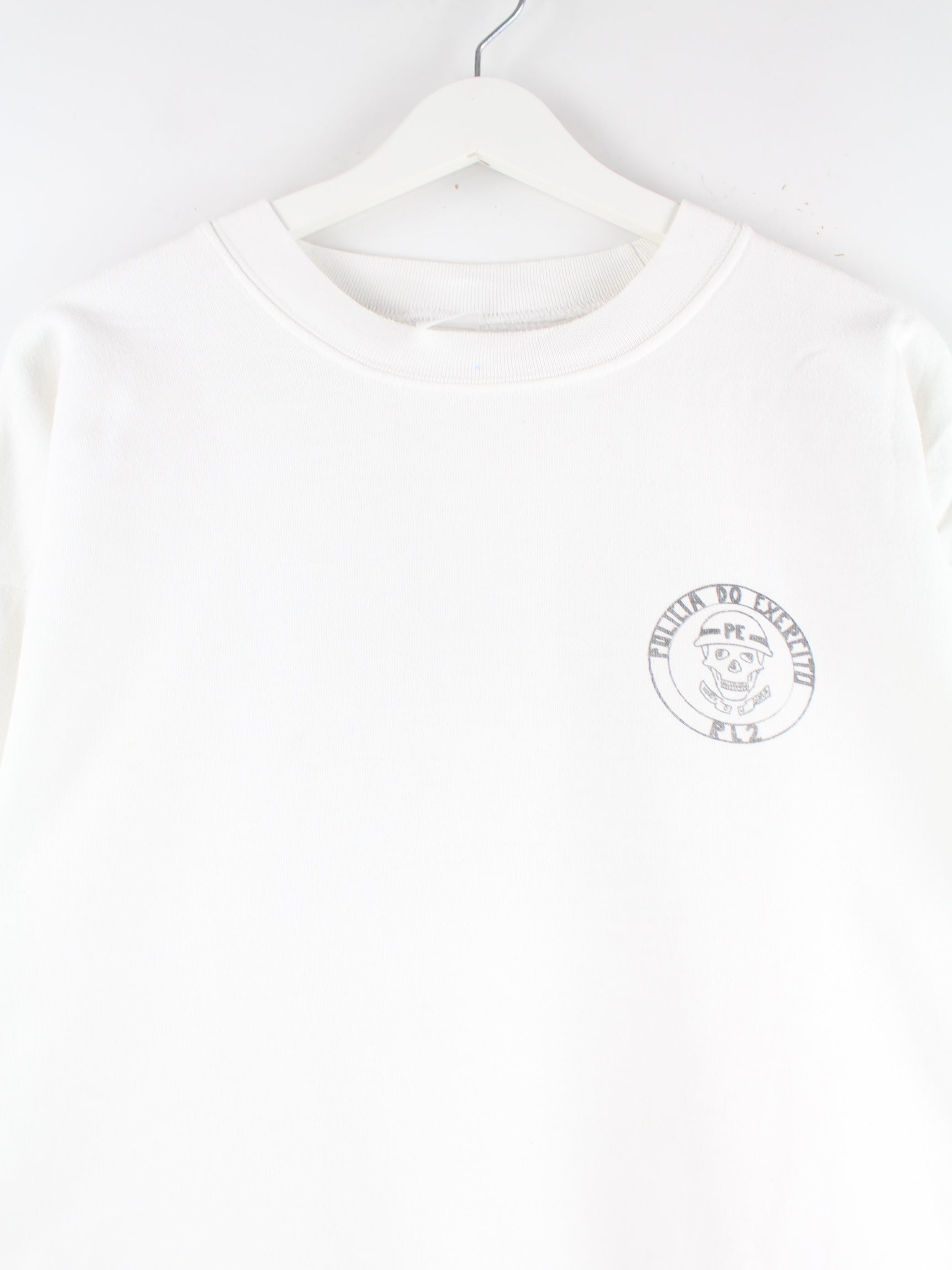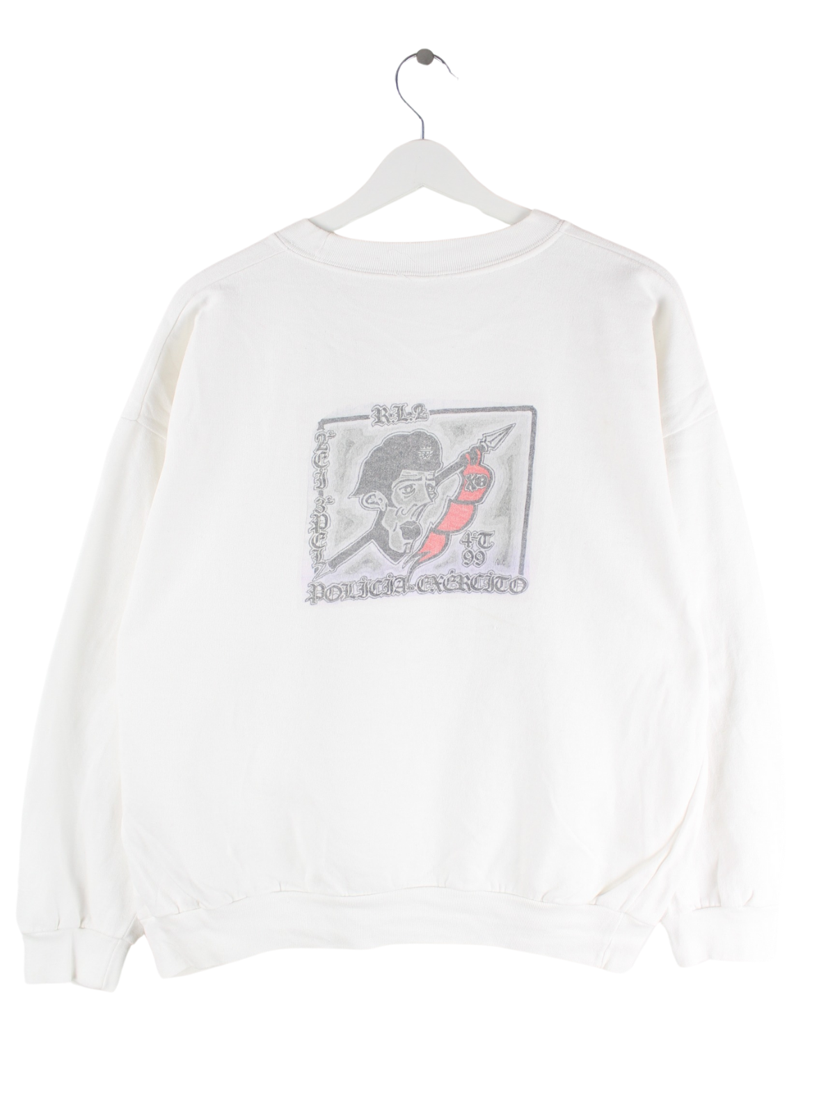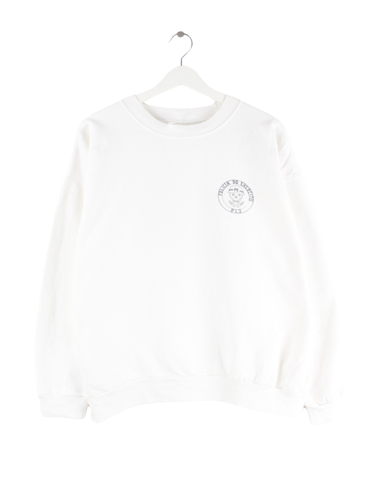 Weißer Vintage Sweater aus den 90'ern in Größe M. Er ist aus einer Baumwollmischung gefertigt und in gutem Zustand bei uns vorrätig. Mit schickem Policia Print.