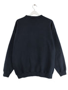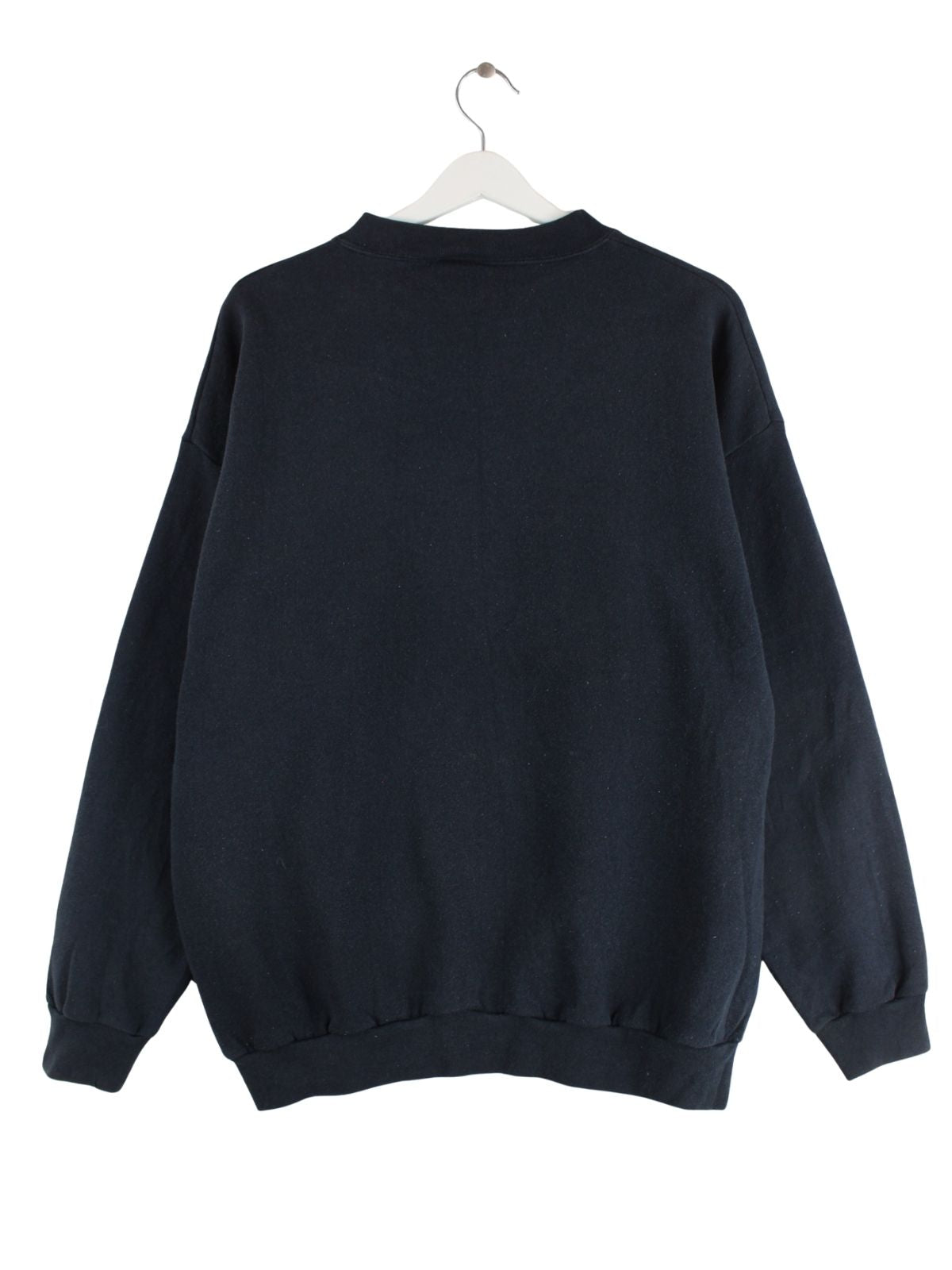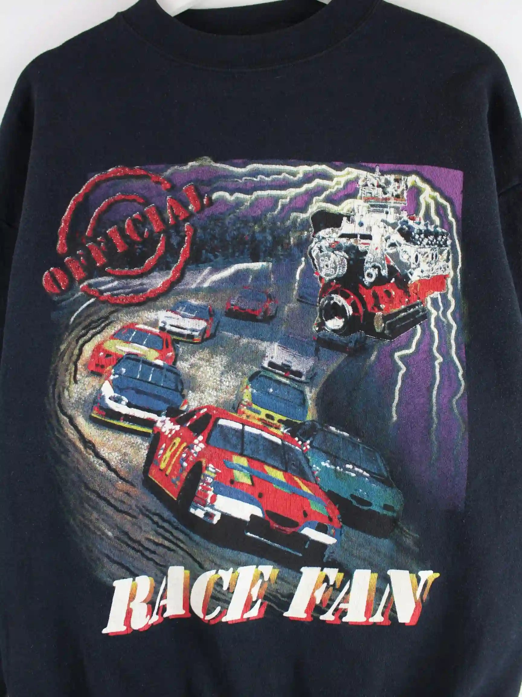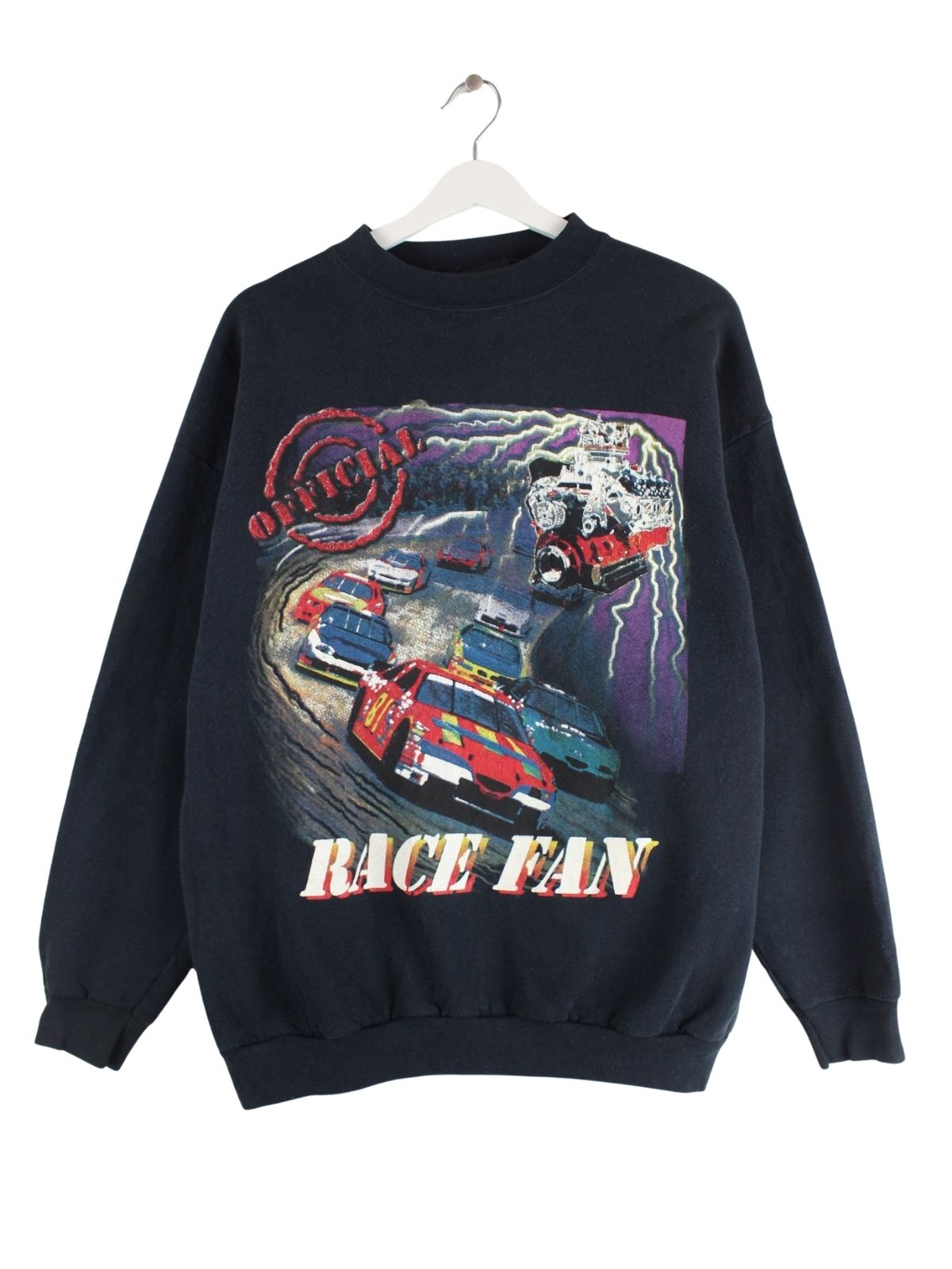 Schwarzer Vintage Sweater aus den 90'ern in Größe M. Er ist aus einer Baumwollmischung und in sehr gutem Zustand auf Lager. Mit chiquem Racing Print.