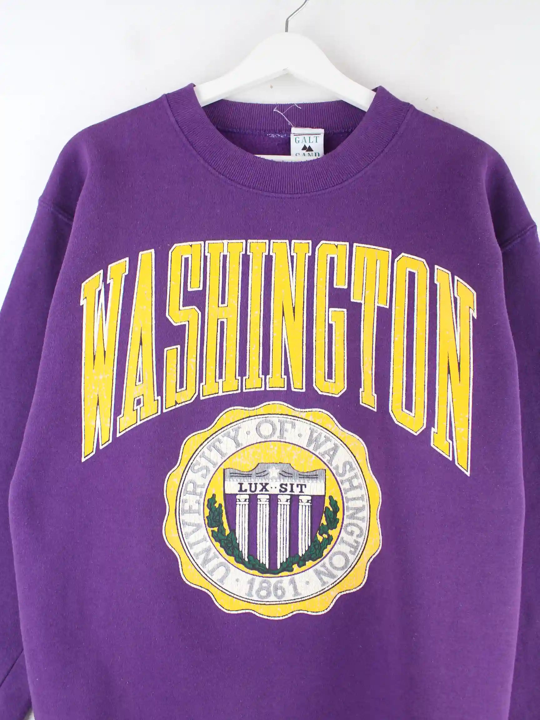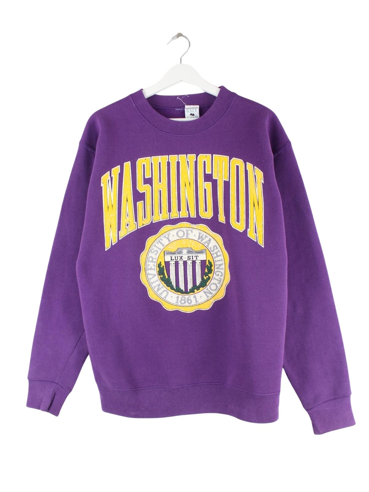 Vintage Sweater in Größe M aus den 90'ern. Er ist aus einer Baumwollmischung und in Lila lieferbar. Mit chiquem Washington Print.