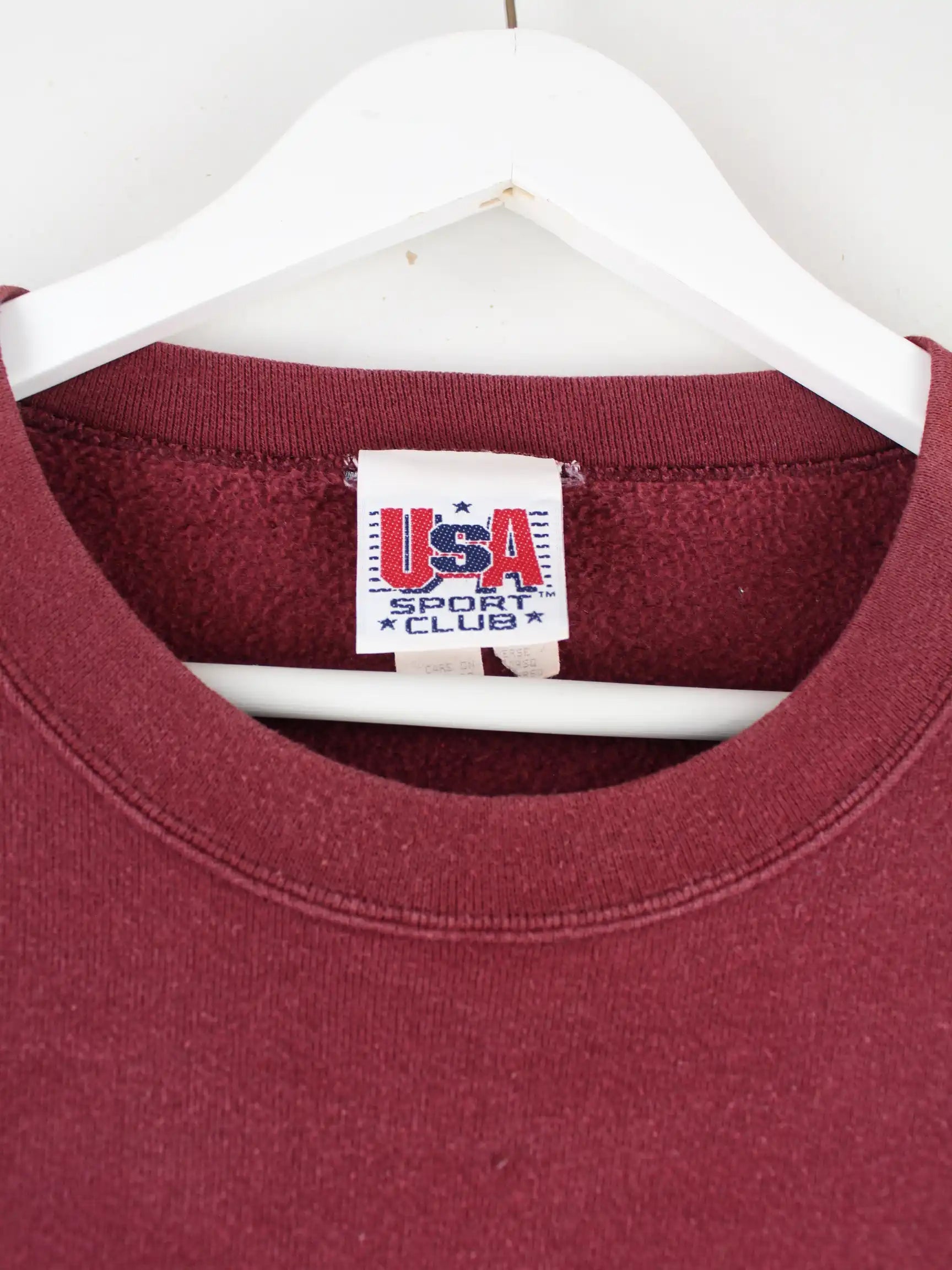 Roter Vintage Sweater mit gesticktem Logo aus den 90'ern in Größe XL. Er ist aus einer Baumwollmischung gemacht und in gutem Zustand zu haben.