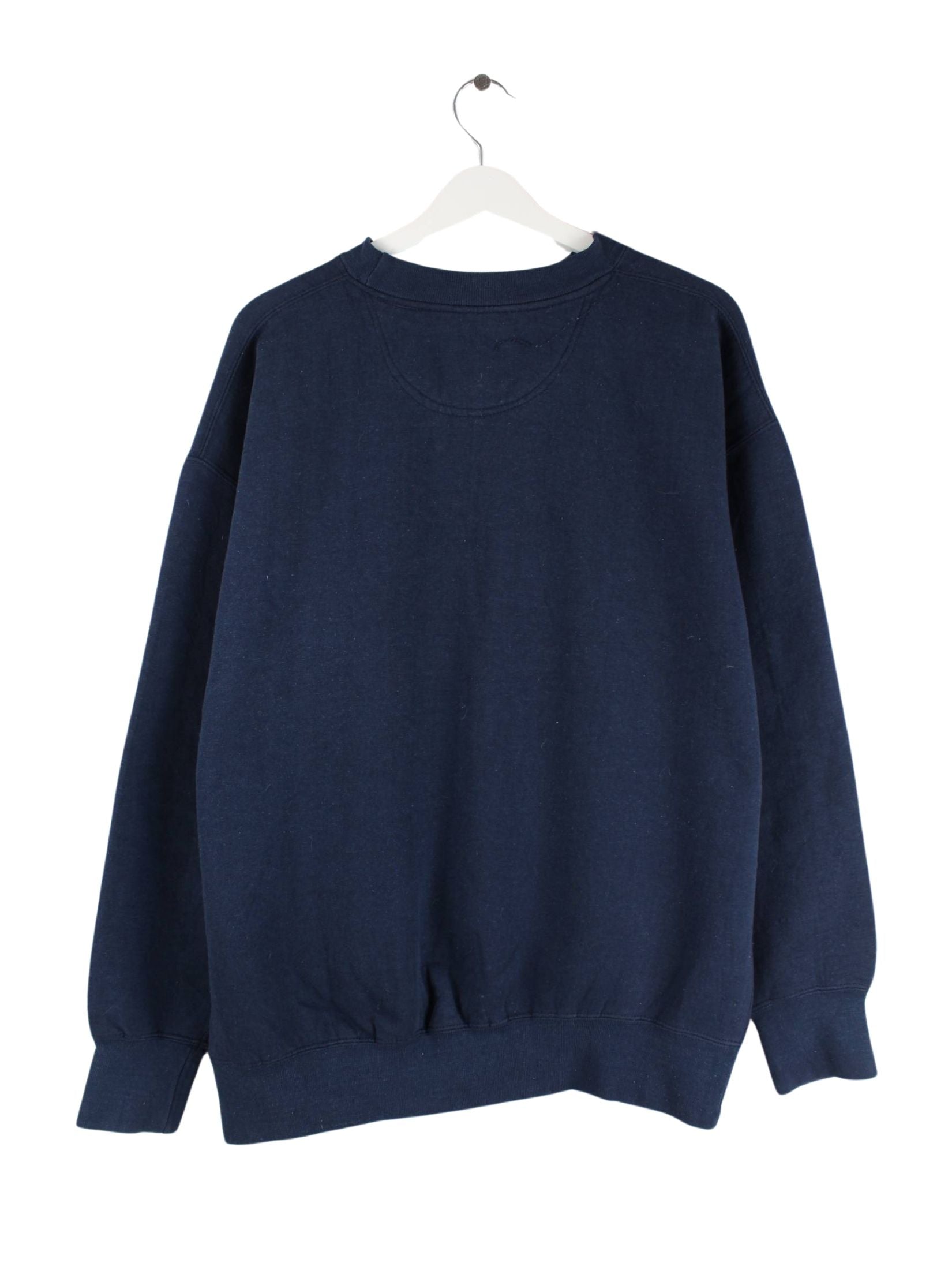 Blauer Vintage Sweater mit gesticktem Logo aus den 90'ern in Größe XL. Er ist aus einer Baumwollmischung angefertigt und in gutem Zustand auf Lager.