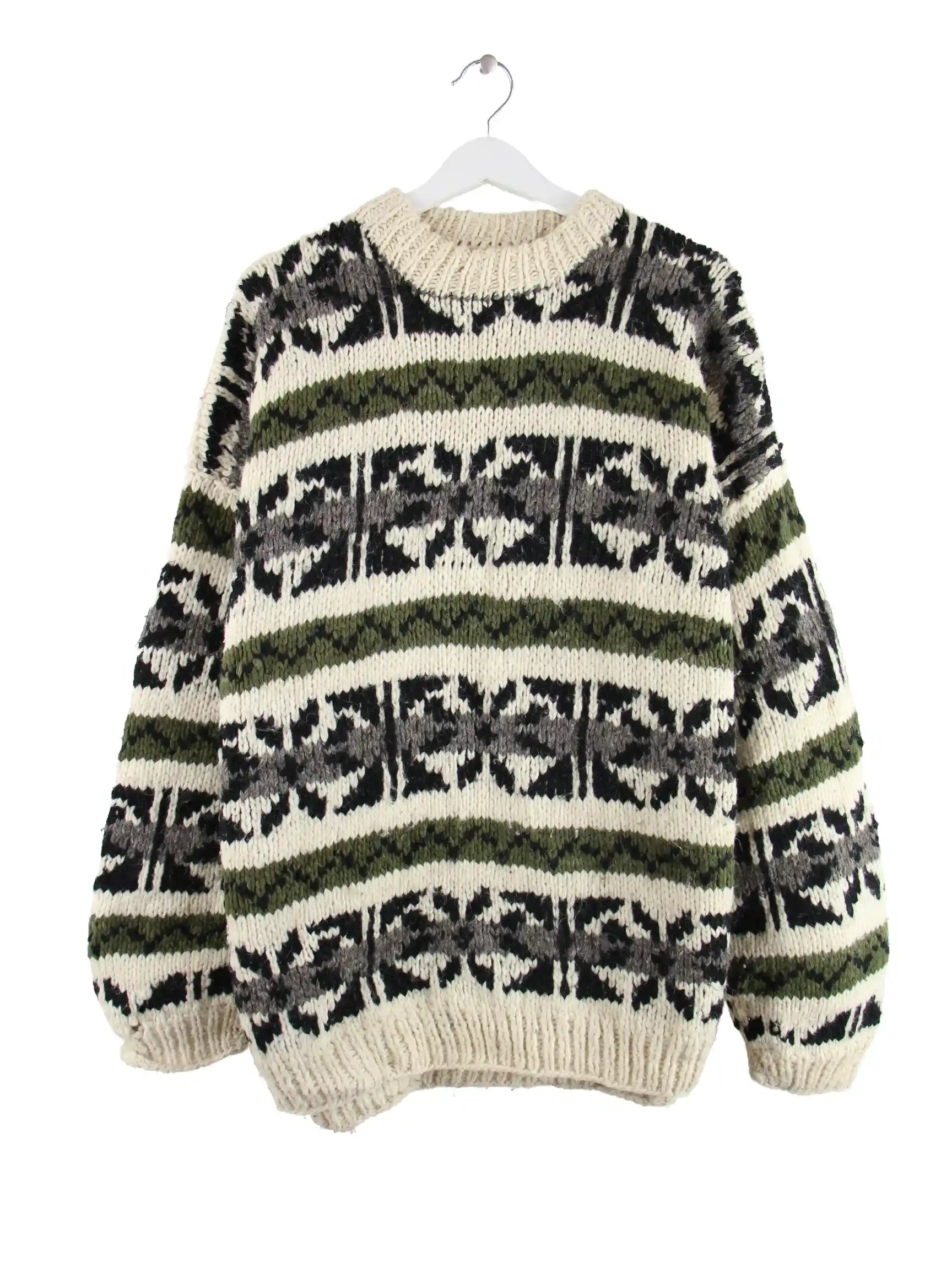 Vintage Pullover in Größe XL aus den 90'ern. Er ist aus Wolle und in Beige vorrätig.
