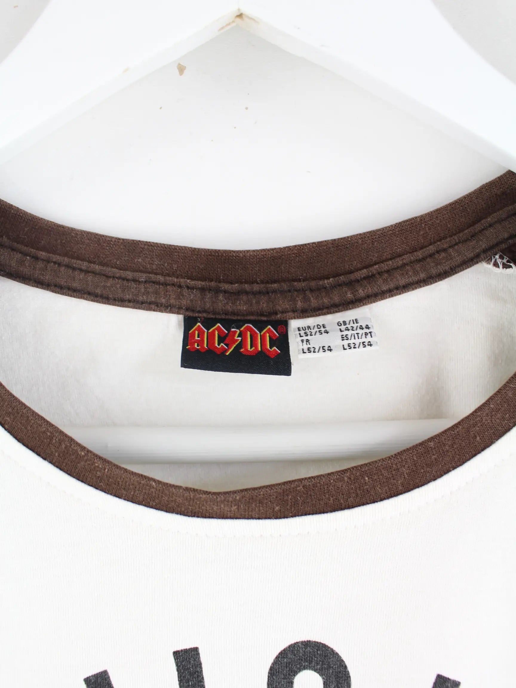 Weißes Vintage T-Shirt in Größe L. Es ist aus Baumwolle gemacht und in sehr gutem Zustand auf Lager. Mit schönem AC-DC Print.