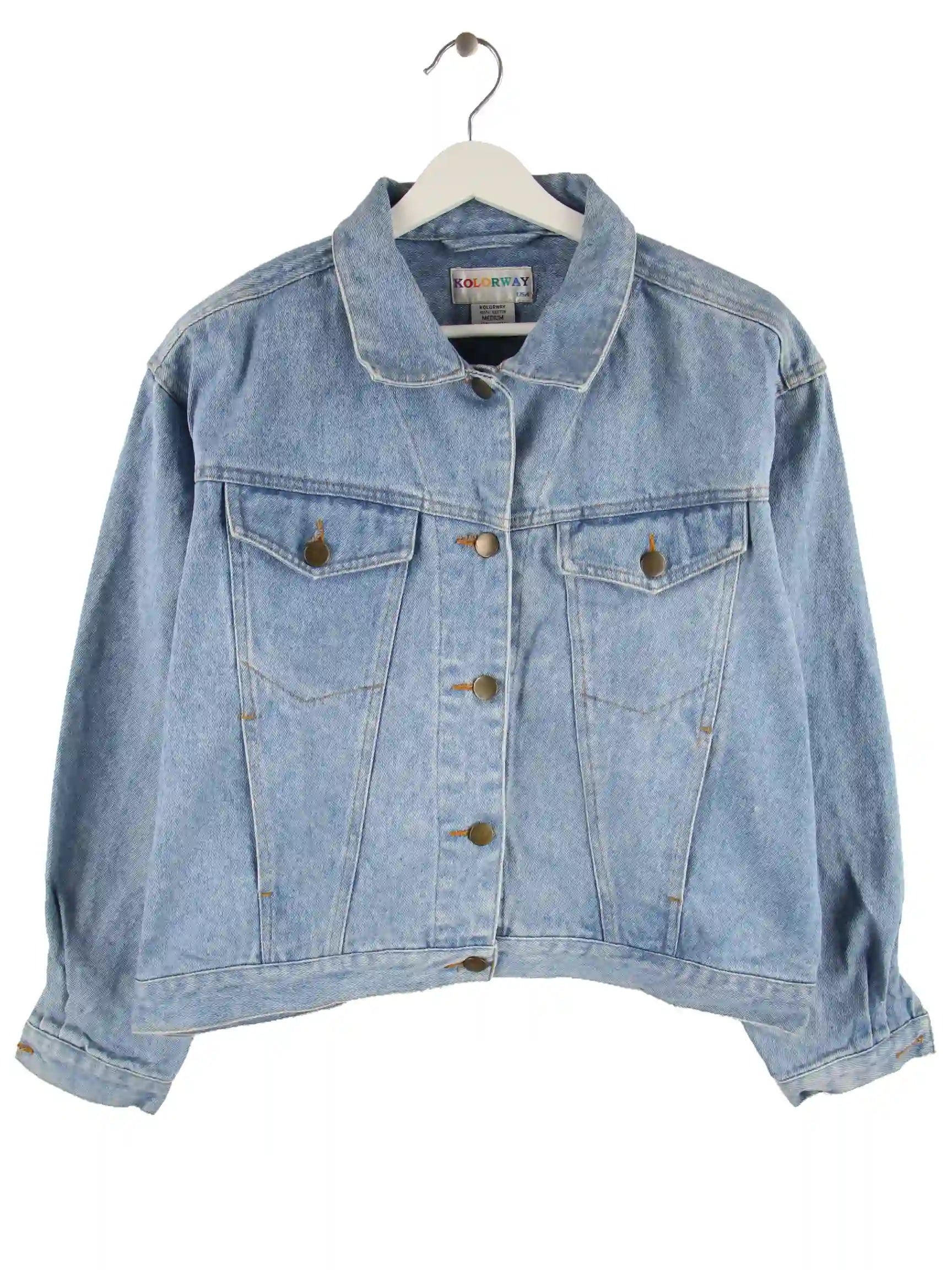 Blaue Vintage Jacke aus den 90'ern in Größe M. Sie ist aus Baumwolle produziert und in sehr gutem Zustand in Stock.