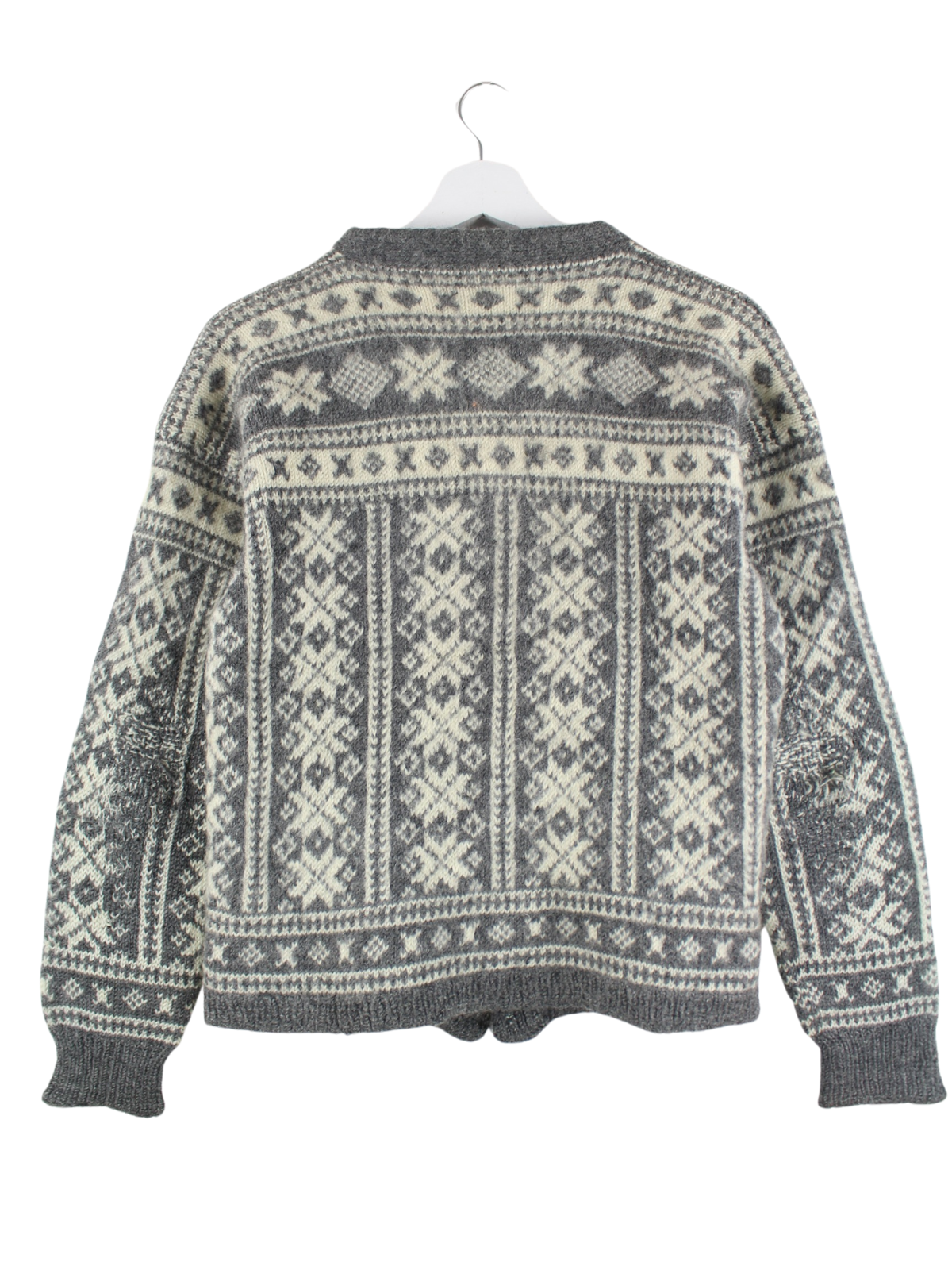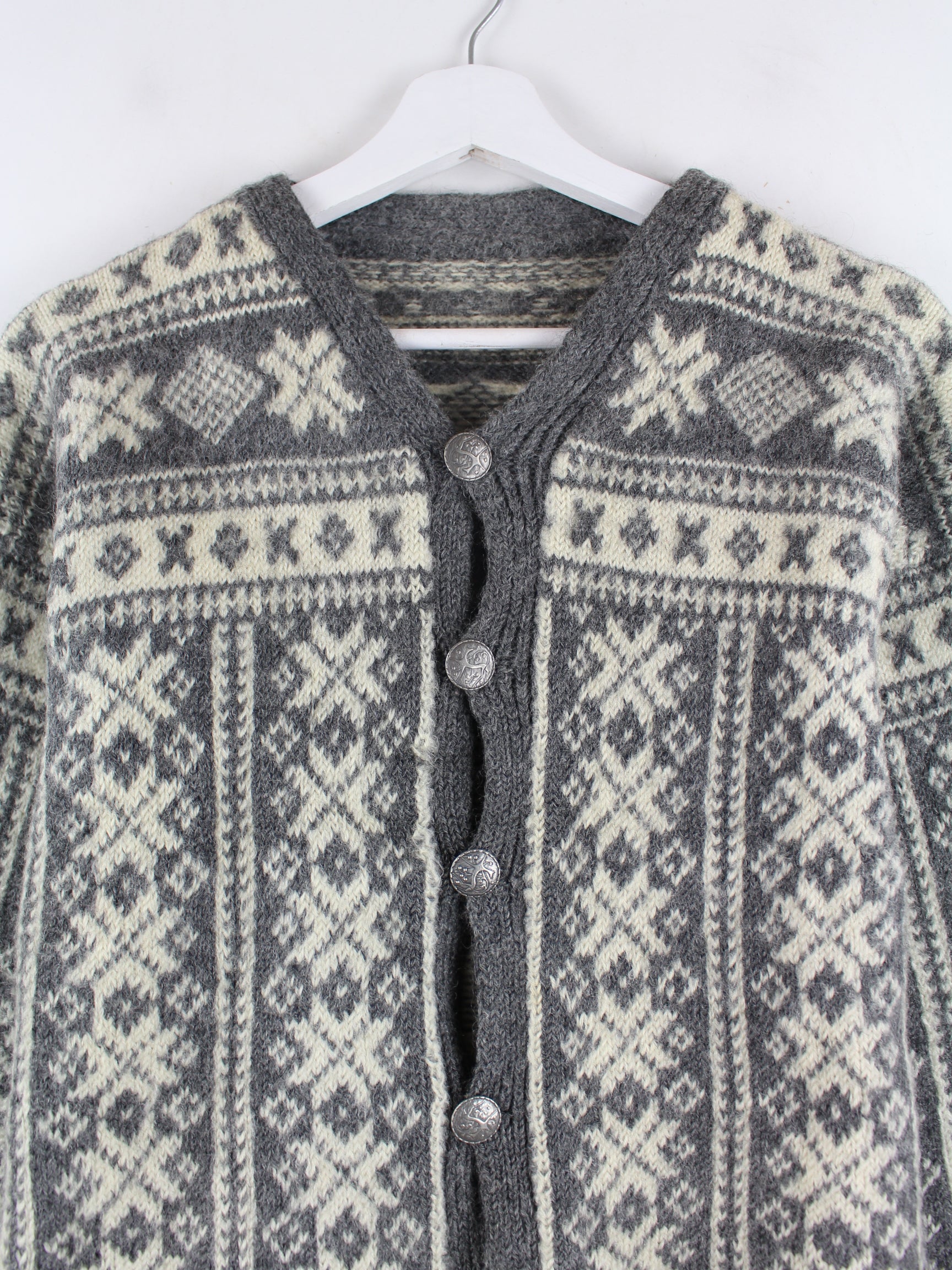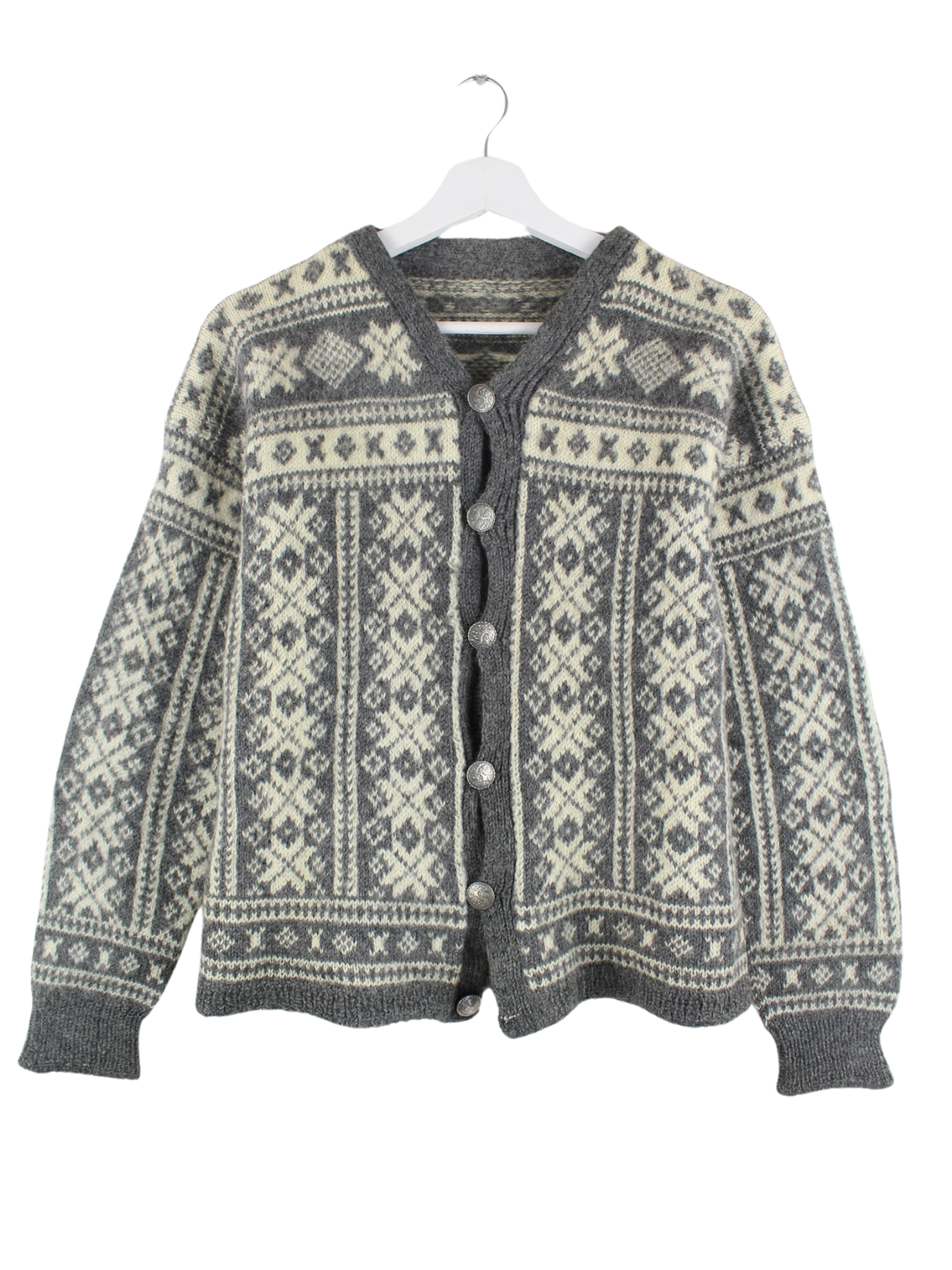 Vintage Strickjacke in Größe S aus den 90'ern. Sie ist aus Synthetik angefertigt und in Grau bei uns vorrätig.