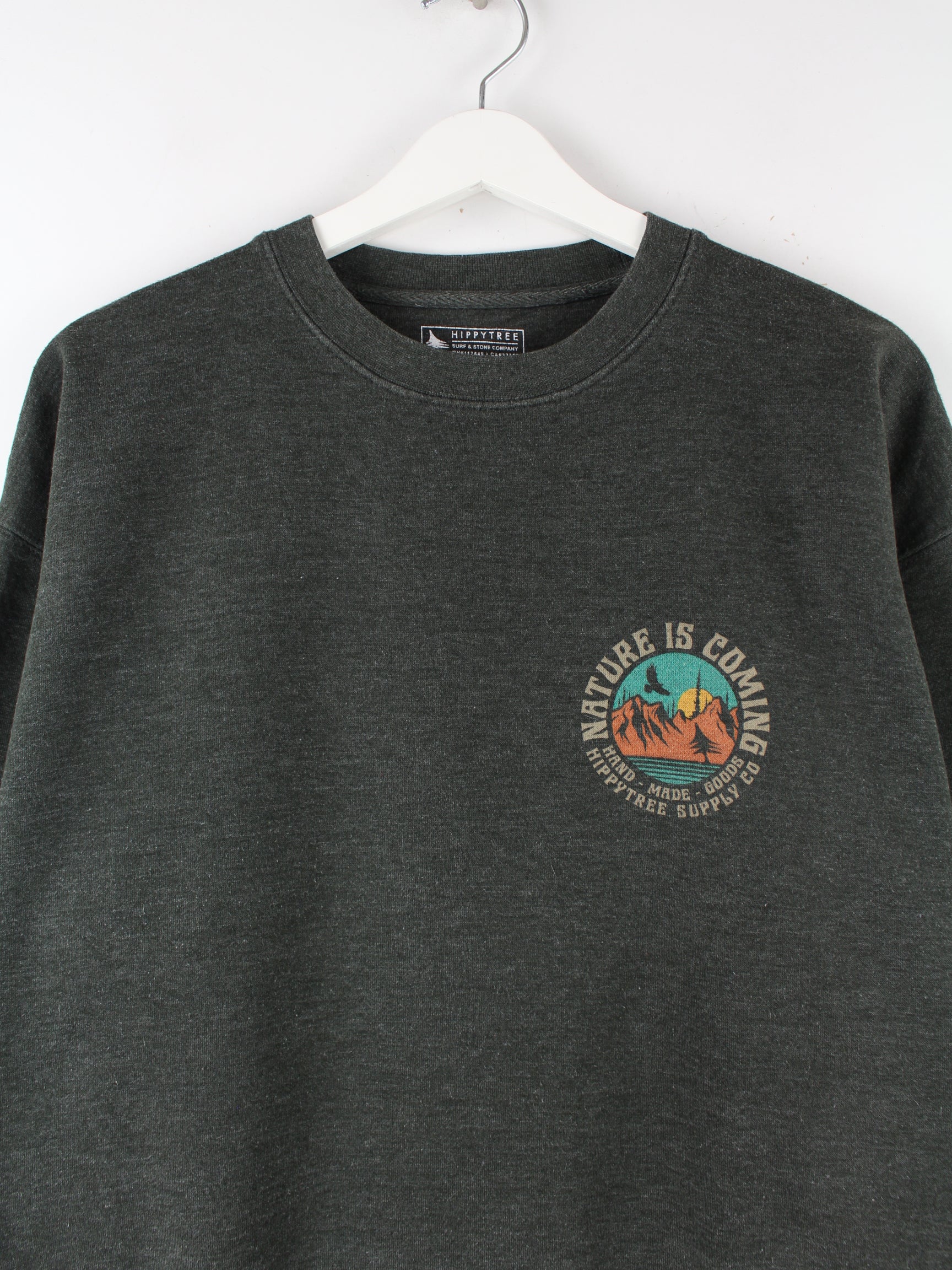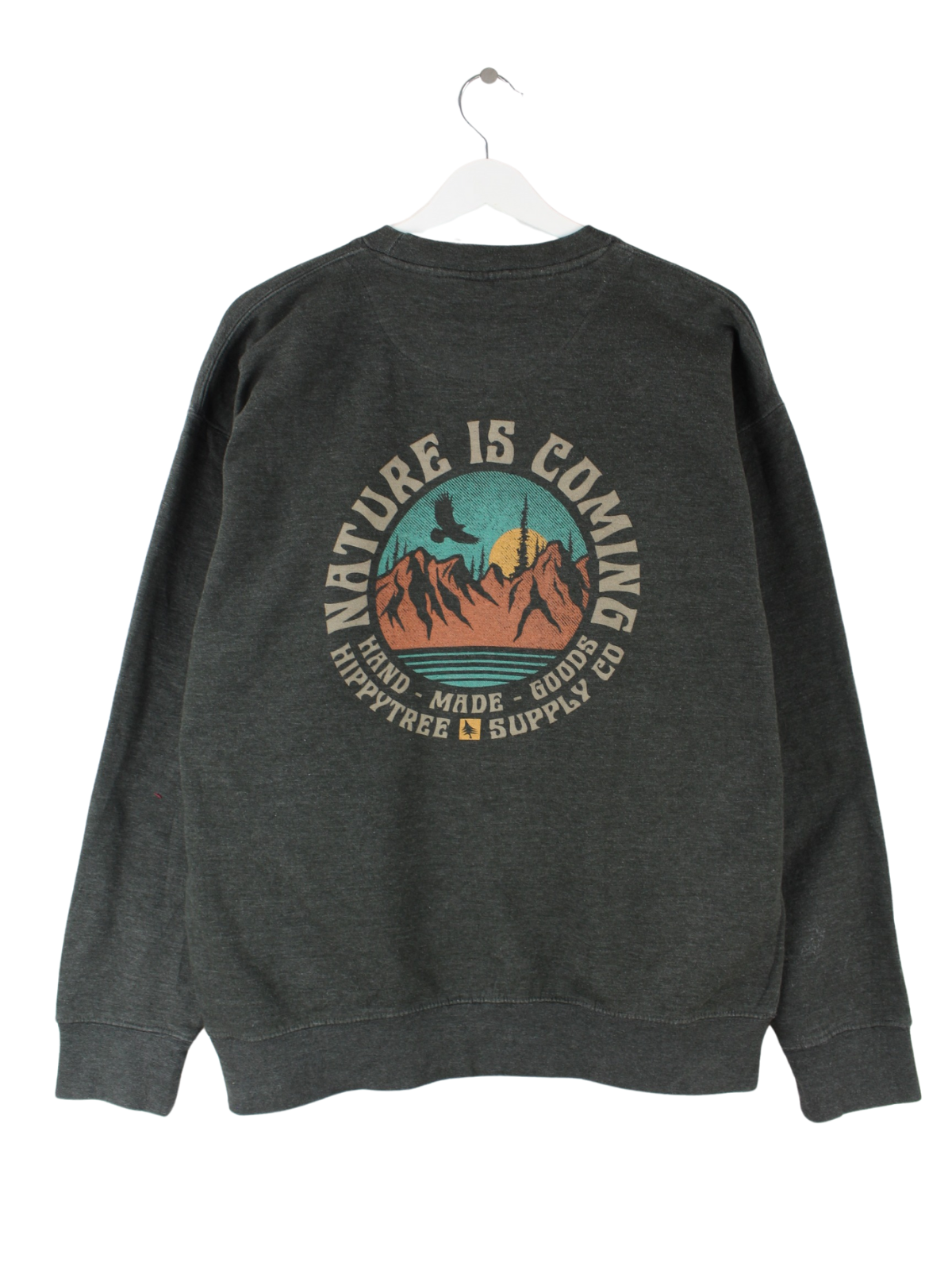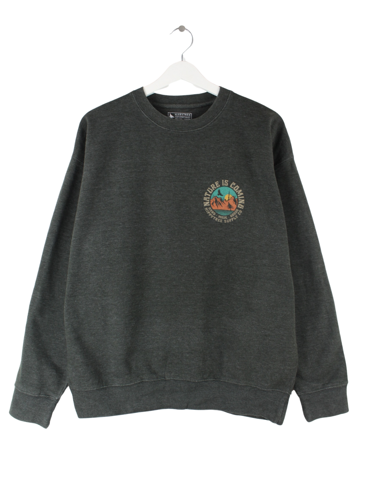 Grauer Vintage Sweater in Größe L. Er ist aus einer Baumwollmischung gefertigt und in sehr gutem Zustand lieferbar. Mit chiquem Coming Print.