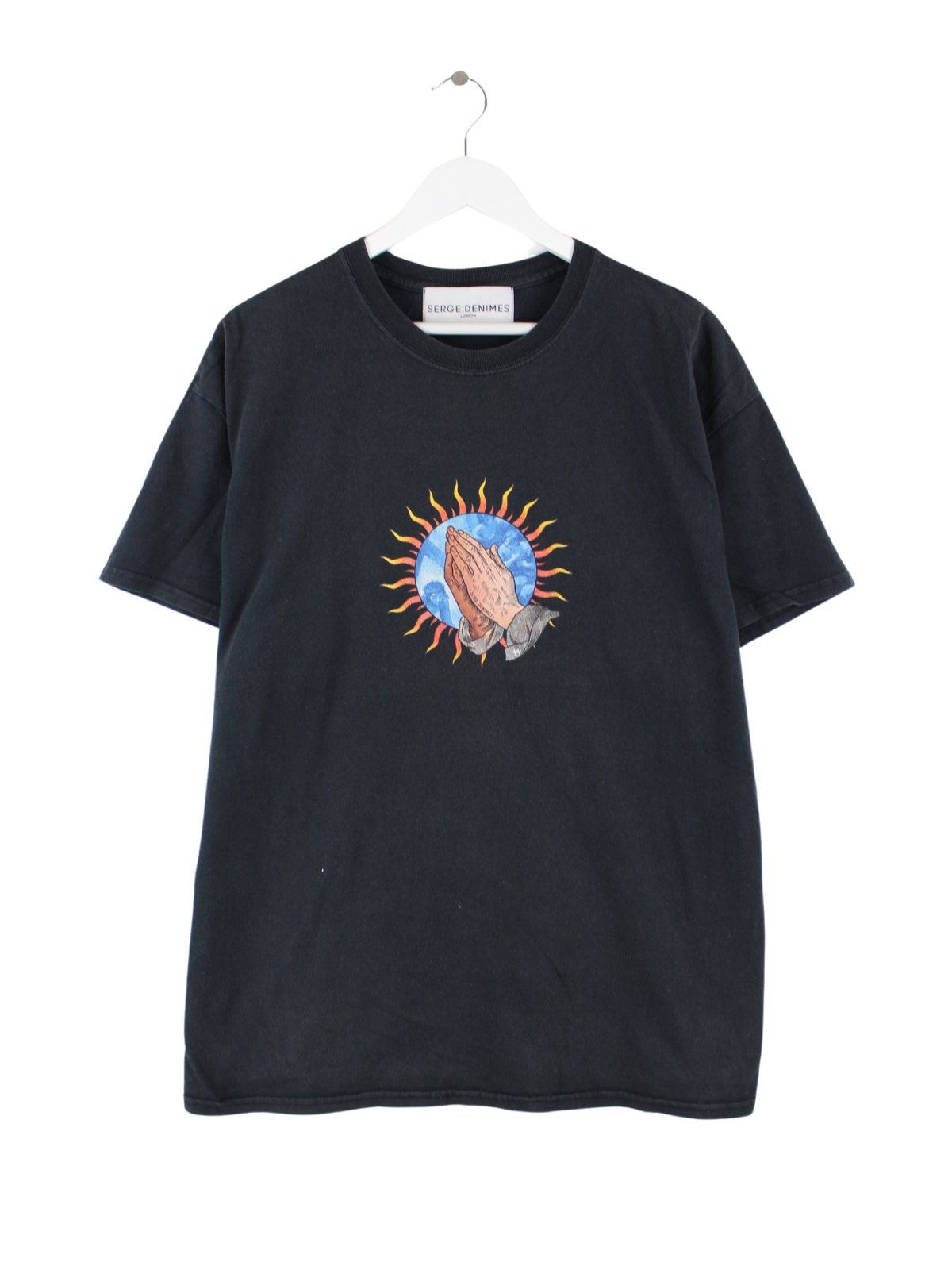 Schwarzes Vintage T-Shirt in Größe L. Es ist aus Baumwolle gefertigt und in sehr gutem Zustand zu haben. Mit schönem Prayer Print.