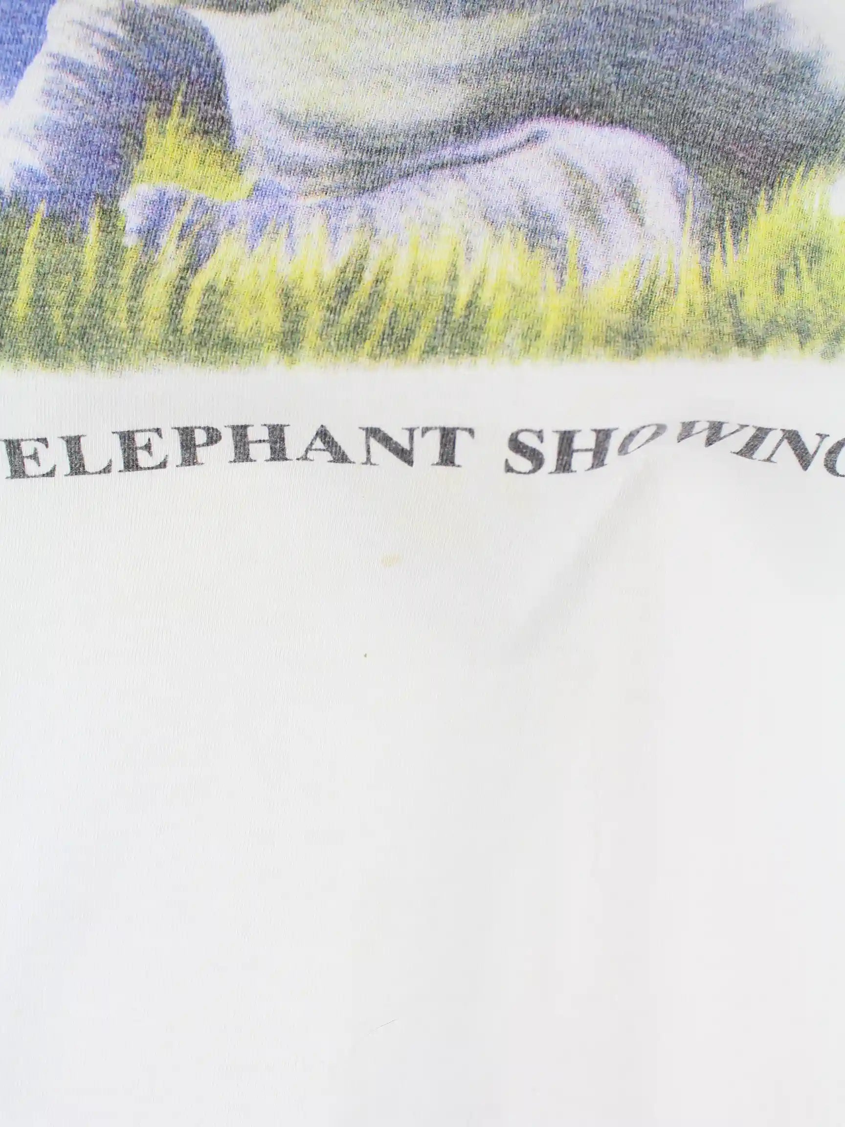 Weißes Vintage T-Shirt in Größe L. Es ist aus Baumwolle angefertigt. Den Zustand würden wir als 'In Ordnung' bezeichnen (vergl. Bilder).Mit tollem Elephant Print.