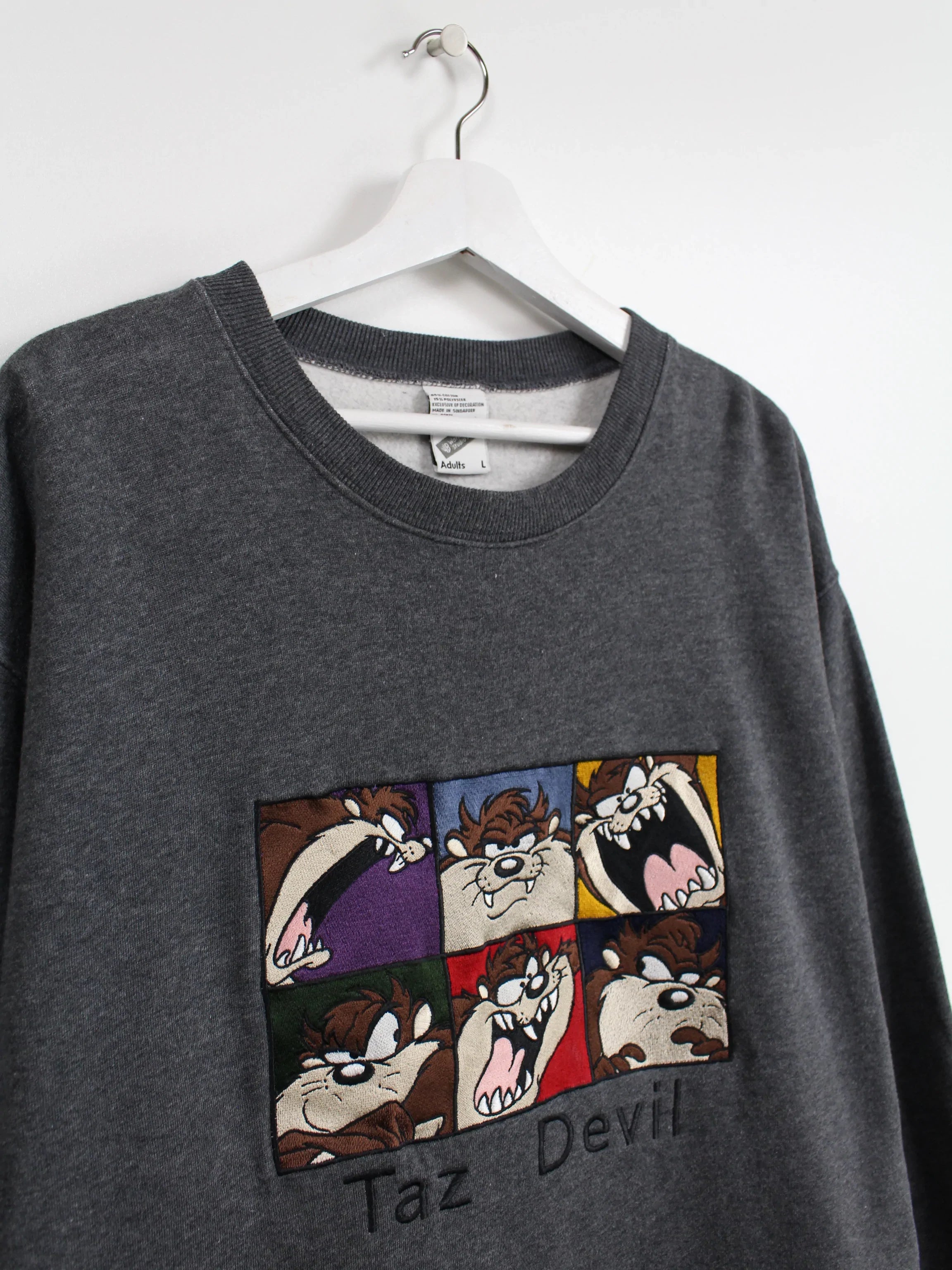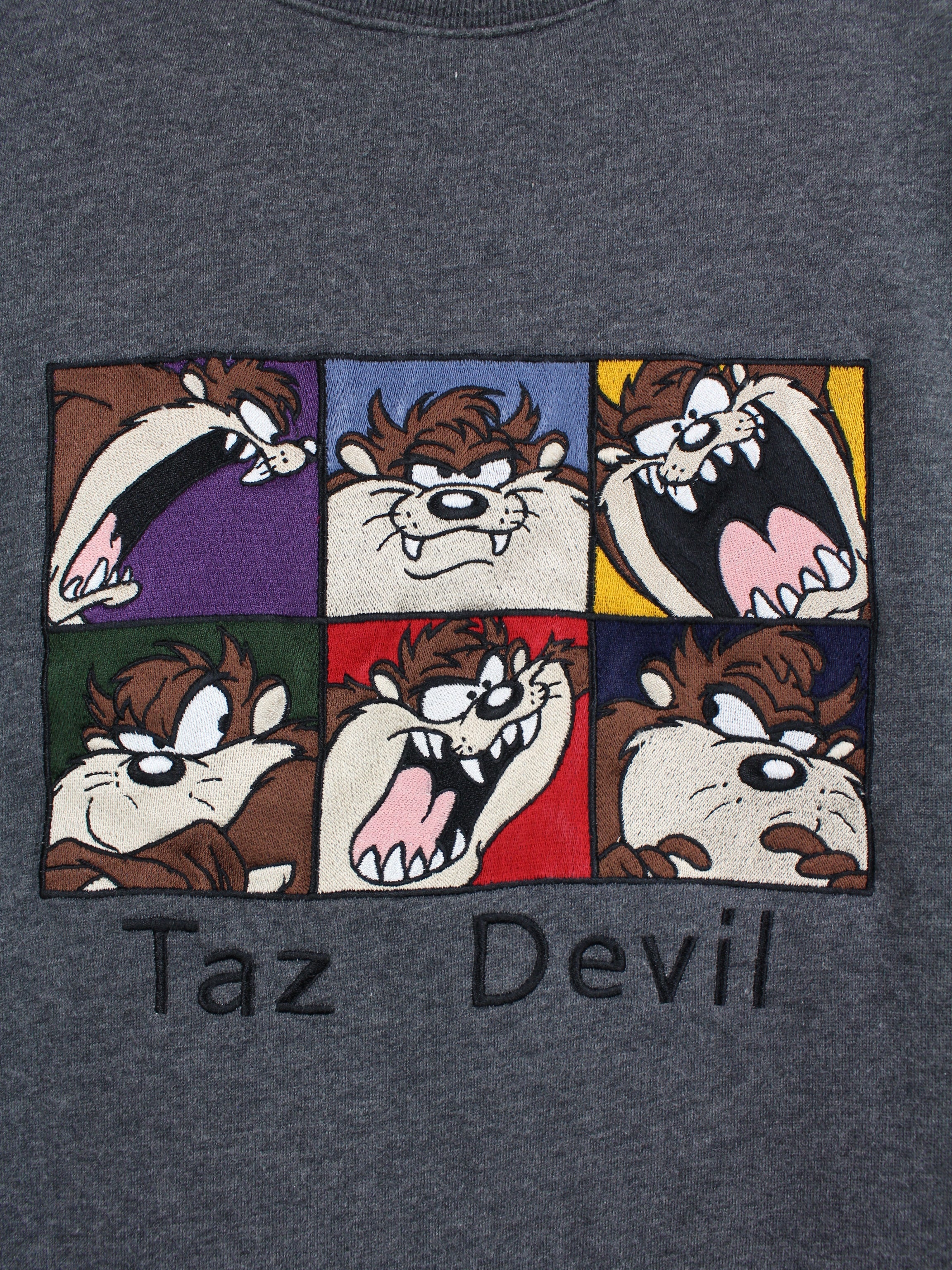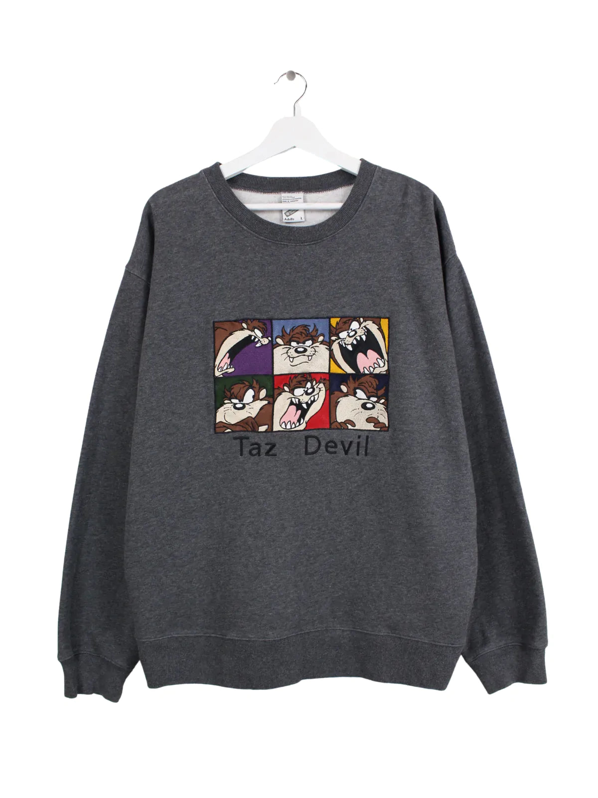 Grauer Warner Bros Sweater mit aufgesticktem Motiv des Tasmanischen Teufels aus der Serie Looney Tunes.